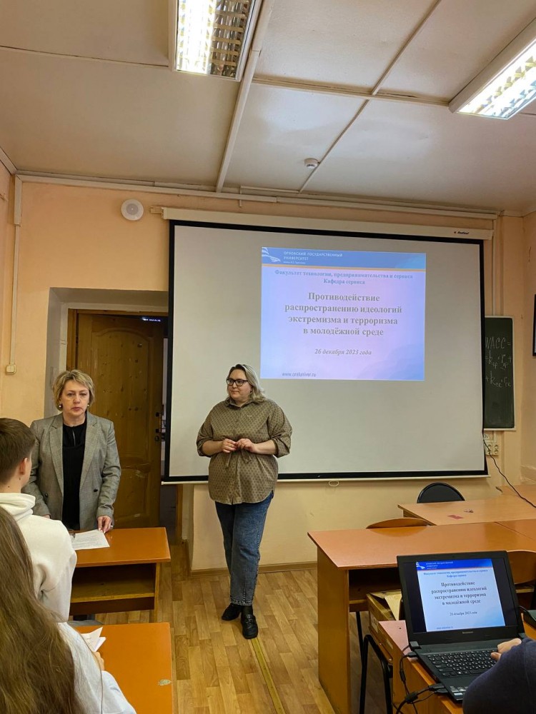 26 декабря 2023 года на базе кафедры сервиса факультета технологии, предпринимательства и сервиса проведено воспитательное мероприятие «Противодействие распространению идеологий экстремизма и терроризма в молодёжной среде» под руководством преподавателей Петрухиной Е.В. и Сальниковой И.Н. В процессе встречи были обсуждены актуальные вопросы: понятие экстремизма и общие черты деятельности экстремистских организаций, правовые основы противодействия экстремизму и терроризму, ответственность за осуществление экстремистской деятельности, направления деятельности Национального антитеррористического комитета, профилактика вовлечения в экстремизм, правила поведения в случае различных террористических угроз.