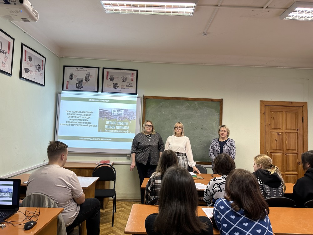 В соответствии с федеральным проектом «Без срока давности» в рамках реализации Дня единых действий в память о геноциде советского народа нацистами и их пособниками в годы Великой Отечественной войны преподаватели кафедры сервиса провели 18 апреля 2024 года мероприятия в рамках проекта «Нельзя забыть, нельзя молчать!» для обучающихся по направлениям подготовки 43.03.01 Сервис, 43.04.01 Сервис.
