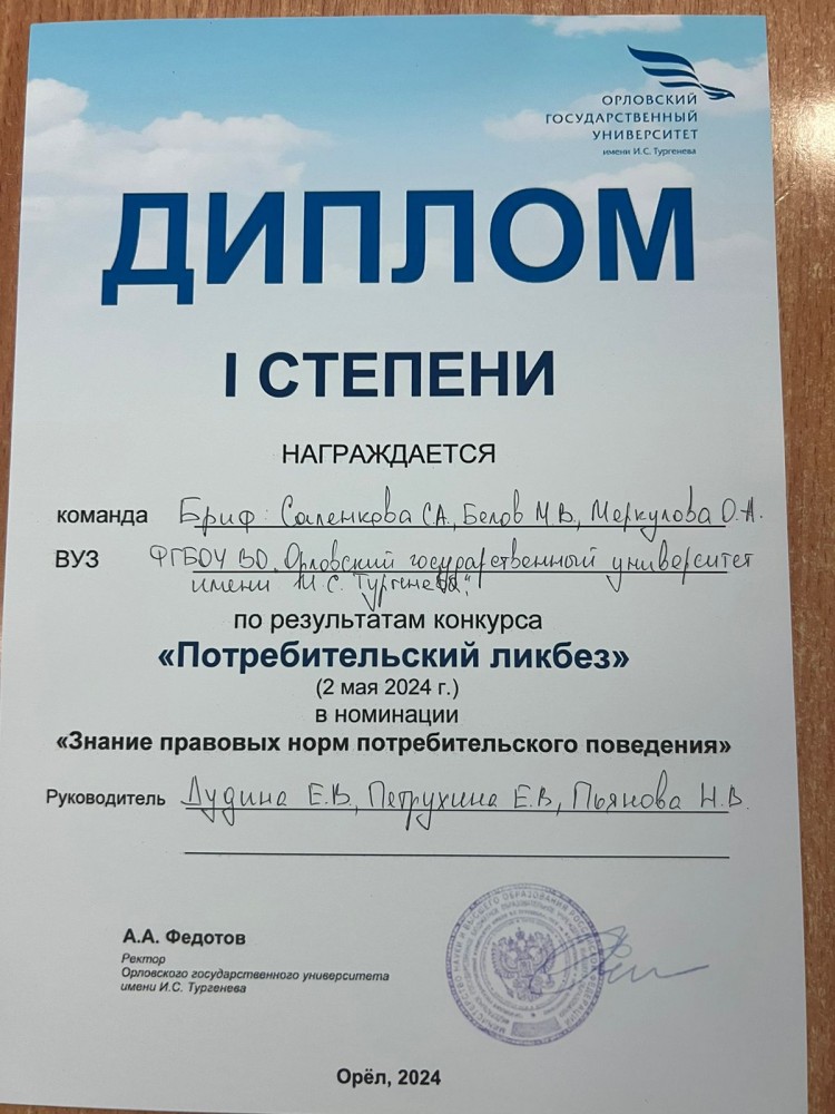 Студенты кафедры сервиса 2 мая приняли участие в пятом межвузовском конкурсе «Потребительский ликбез», организованном в ОГУ им. И.С. Тургенева при поддержке Управления Роспотребнадзора по Орловской области. За звание лучших знатоков закона «О защите прав потребителей» соревновались 9 команд участниц из трех ВУЗов города Орла.