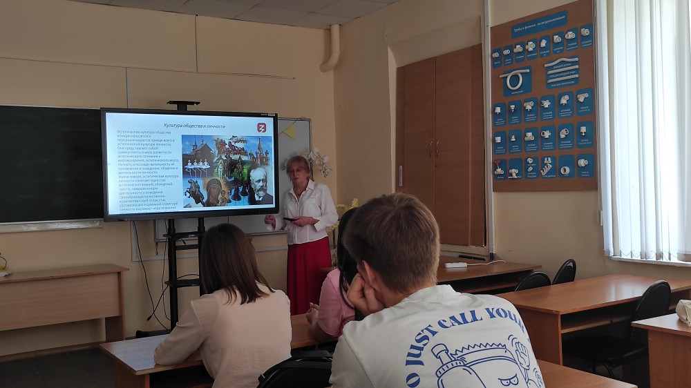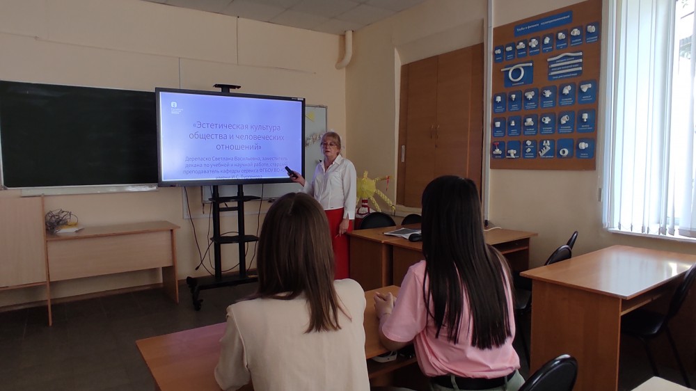 В целях формирования эстетической культуры у молодёжи в рамках открытого лектория Российского общества «Знание» 19 июня 2024 года на базе факультета технологии, предпринимательства и сервиса состоялась публичная лекция «Эстетическая культура общества и человеческих отношений». Преподаватель кафедры сервиса Дерепаско Светлана Васильевна встречалась со студентами, обучающимися по направлению подготовки 43.03.01 Сервис (профиль: Управление бизнес-процессами в сфере услуг). Присутствующим было интересно узнать о том, что это за понятие «эстетическая культура». Эстетическая культура охватывает способы организации и выражения нравственной, религиозной, политической культуры, технической, физической культуры, культуры быта, общения, речи, и т.д. Студенты получили информацию о развитии эстетики человеческих отношений, культуры эстетики личности, задумались о дальнейшем развитии эстетической культуры в форме самообразования.