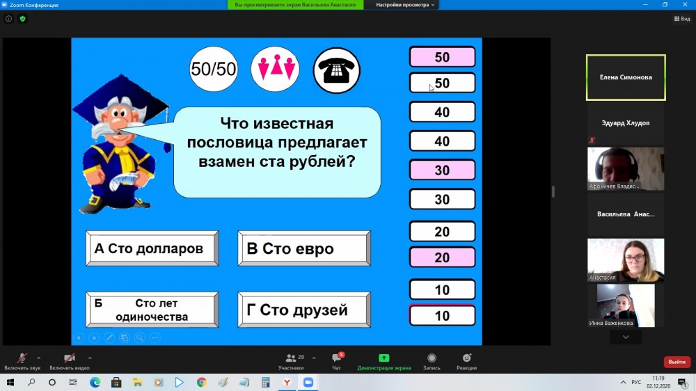 Дистанционное обучение - время очень нелегкое для студентов нашего университета. Необходимо выполнять задания, выкладывать в личный кабинет, настраивать камеры, микрофоны… Как все сложно!! А еще экзамены с зачетами на подходе. Дистанционное обучение очень утомляет, это сейчас знает каждый и даже психологи заговорили о негативном влиянии на психологическое состояние граждан. Поэтому мы стараемся скрасить обучение дома и разнообразить учебный процесс чем-то новым и интересным. Сегодня студенты 1-го курса направления подготовки 44.03.04 Профессиональное обучение (по отраслям), направленность (профиль) Экономика и управление провели мероприятие в ОНЛАЙН формате для студентов автодорожного техникума. Состоялась увлекательная интеллектуальная игра, подарившая студентам множество положительных эмоций.