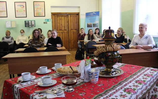 Приветственным словом мероприятие открыла заведующий кафедрой профессионального обучения и бизнеса Кузнецова Е.В. Она рассказала о традициях празднования третьего дня Масленицы «Лакомка».
