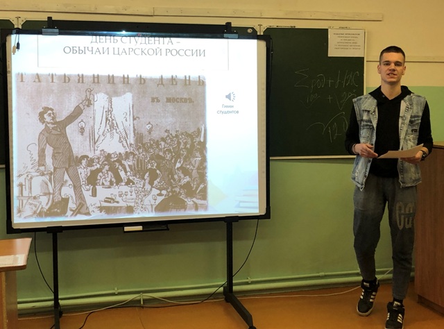 В рамках празднования на кафедре профессионального обучения и бизнеса факультета технологии, предпринимательства и сервиса было проведено мероприятие социально-культурной направленности «День российского студенчества - Татьянин день». Цель проведения - воспитание эмоционально-ценностного отношения к истории, культуре и духовно-нравственным традициям российского общества.