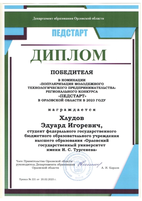 По итогам конкурса победителем в категории «Высшее образование» признан Куракин Никита Александрович – студент 1 курса магистратуры ФГБОУ ВО «ОГУ имени И.С. Тургенева». Победителями в номинации «Популяризация молодежного технологического предпринимательства» признаны также студенты направлений подготовки 44.03.04 и 44.04.04 «Профессиональное обучение (по отраслям): Батищева Лилия Николаевна, Переведенцева Елизавета Владимировна, Хлудов Эдуард Игоревич, Шалимова Полина Сергеевна.