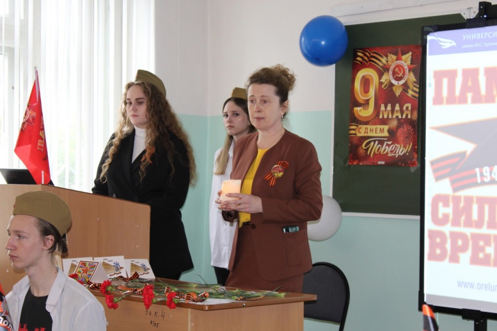 1. Лекция «Свеча памяти, поклонимся великим тем годам», представлены документальные кадры об оккупации Орловской области в годы войны, информация направленная на сохранение исторической памяти о войне. Далее студенты читали стихотворения, вспоминали песни военных лет вместе с преподавателями.