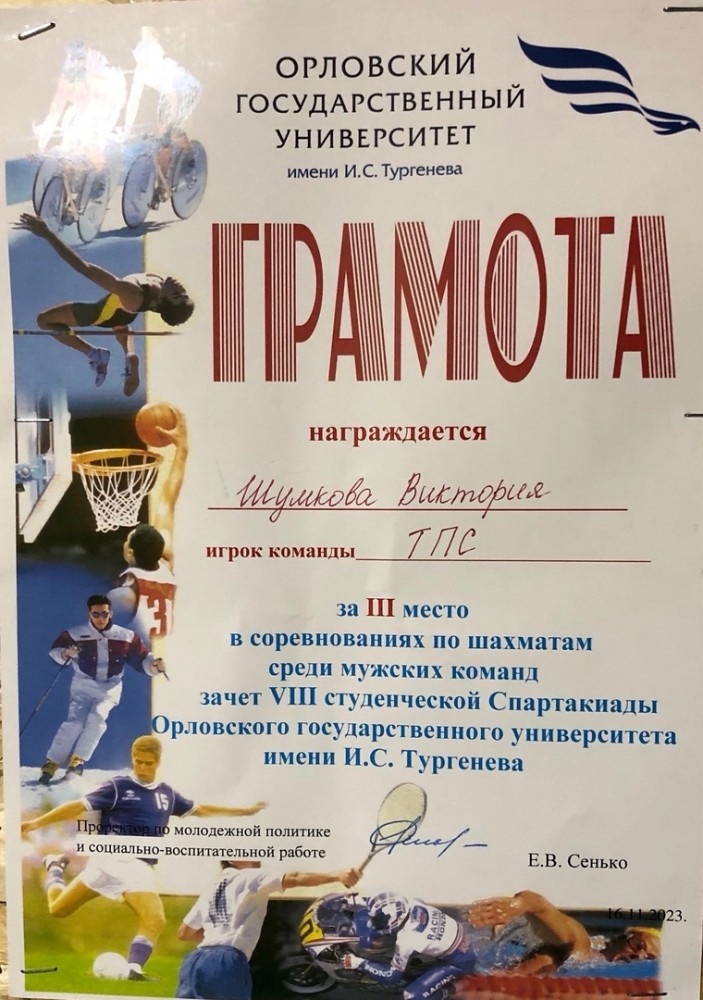15 ноября проходил шахматный турнир среди девушек в рамках Университетской Спартакиады. Студентка кафедры технологии и предпринимательства Шумкова Виктория заняла 3 место по итогам командного зачета в составе команды факультета технологии, предпринимательства и сервиса.