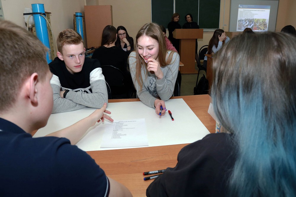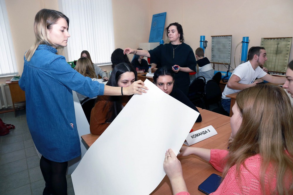 Заведующая кафедрой технологии и предпринимательства Валентина Тенетилова рассказала школьникам о порядке работы. Они были разбиты на пять команд. Первым этапом стало знакомство.