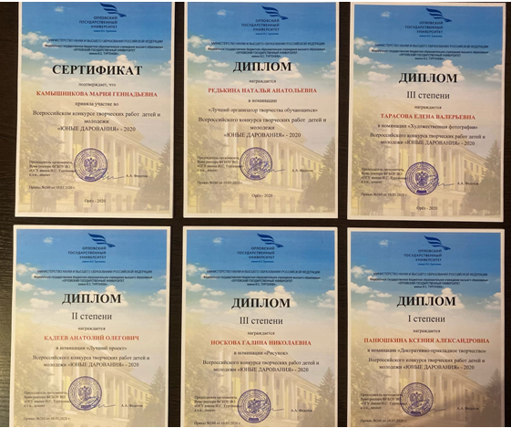 15.05.2020 г. состоялось подведение результатов Всероссийского конкурса творческих и научно-исследовательских работ школьников и студентов «Юные дарования», который в этом году проходил в онлайн режиме. Конкурс организован факультетом технологии, предпринимательства и сервиса ФГБОУ ВО «ОГУ И.С. Тургенева» и БУ ОО ДПО «Институт развития образования» в целях раскрытия творческих способностей одаренных детей и талантливой молодежи. Основные задачи Конкурса: выявление перспективных талантливых и одаренных детей и молодёжи; стимулирование творческой активности одаренных детей и молодежи, совершенствование их мастерства в техническом и декоративно-прикладном творчестве; повышение качества профильной направленности обучающихся и выпускников средних образовательных школ, лицеев, гимназий, начальных и средних профессиональных учебных заведений, высших учебных заведений.