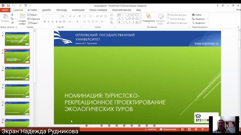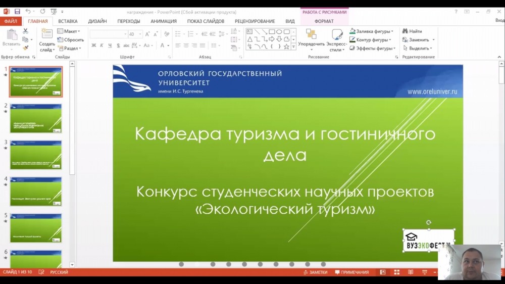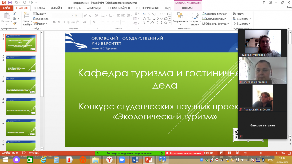 В соответствии с программой проведения VI молодежного фестиваля в области экологии и устойчивого развития «ВузЭкоФест» 30 сентября 2020 кафедра туризма и гостиничного дела подвела итоги конкурса студенческих научных проектов «Экологический туризм» в дистанционном формате.