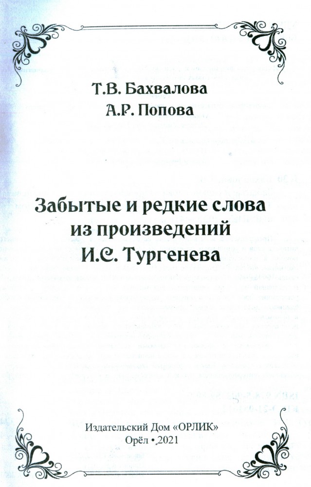 Словарь "Забытые и редкие слова из произведений И.С. Тургенева", созданный доктором филологических наук, профессором Татьяной Бахваловой и доктором филологических наук Анной Поповой, вошел в пятьдесят лучших региональных изданий, выпущенных в 2021 году. Это единственное издание в рейтинге от Орловской области. Рейтинг составлен на основании заключений экспертных советов конкурса АСКИ (Ассоциация книгоиздателей России ) «Лучшие книги года»-2021 с учетом поступивших на конкурс книг.