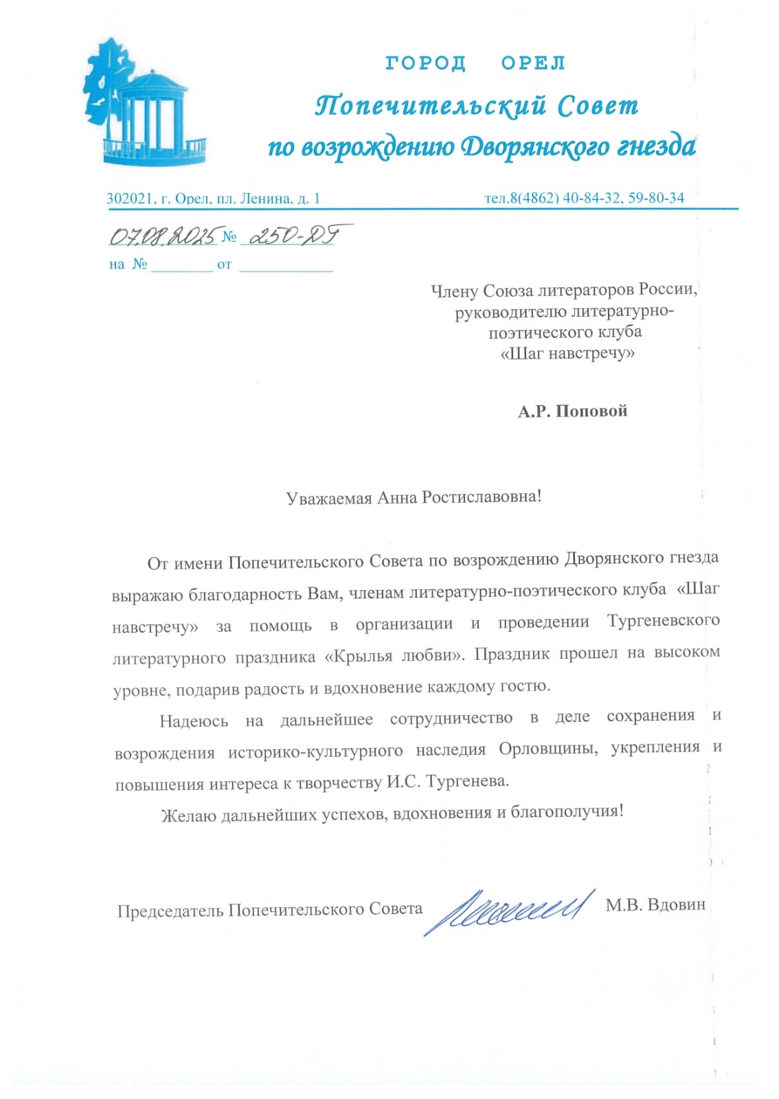 За помощь в организации и проведении Тургеневского литературного праздника Поповой А.Р. была выражена благодарность от Попечительского совета по возрождению Дворянского гнезда.