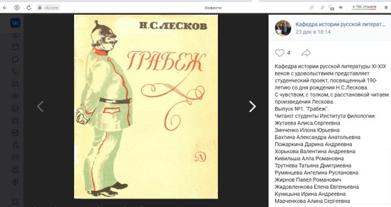 Во-первых, было проведено мероприятие «Читаем классику: Н.С. Лесков». Студентами 1 курса (профиль «Филология»), 2 курса (профили «Русский язык и литература» и «Журналистика») и 4 курса (профиль «Филология) подготовили выразительное чтение рассказов Н.С. Лескова «Грабеж», «Прекрасная Аза» и «Лев старца Герасима», записали видеоролики и разместили их на канале YouTube и странице кафедры истории русской литературы ВКонтакте.