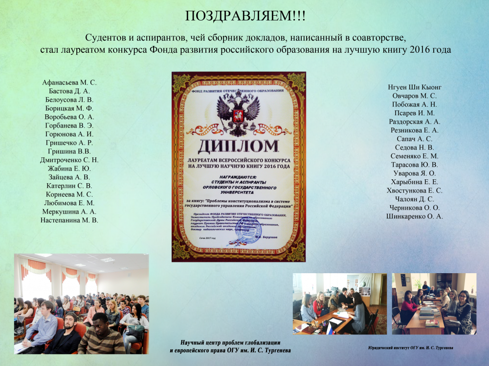 Президентом Фонда Развития Отечественного Образования дипломом "За лучшую научную книгу 2016 года" были награждены студенты и аспиранты Орловского государственного Университета им. И.С. Тургенева за книгу "Проблемы конституционализма в системе государственного управления Российской Федерации".