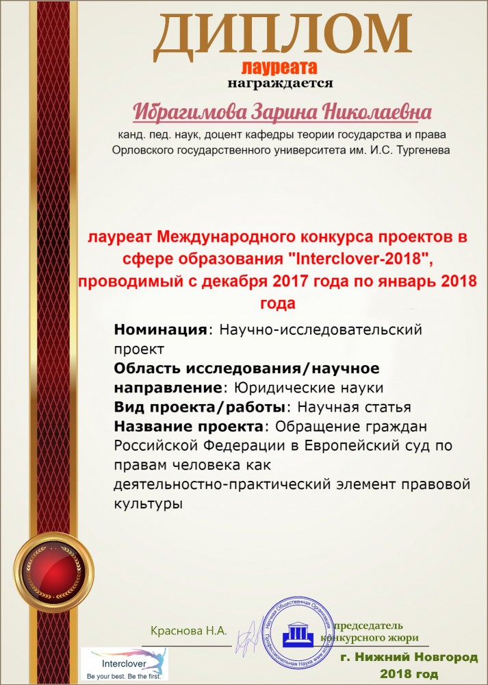 Доцент кафедры теории государства и права стала лауреатом Международного конкурса проектов в сфере образования "Interclover-2018". Название проекта" Обращение граждан РФ в Европейский Суд по правам человека как деятельностно-практический элемент правовой культуры". Поздравляем!