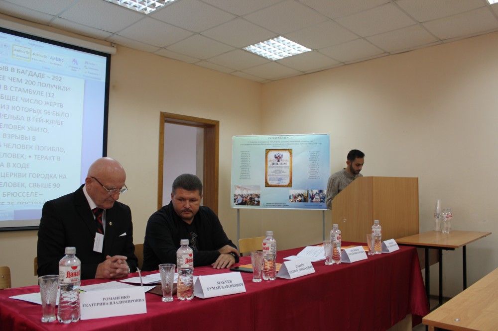 Научный Центр проблем государства и права и кафедра теории государства и права Юридического Института ОГУ им. И.С. Тургенева (директор НЦ и зав. кафедрой проф. Макуев Р.Х.) 18 декабря 2018 г. подготовили и провели Международную научно-практическую студенческую конференцию «Современный терроризм: эффективное противодействие», которая прошла под девизом: «Террор – враг человечества! Антитеррор – долг человечества!». Председательствовал на конференции проф. Р.Х.Макуев.