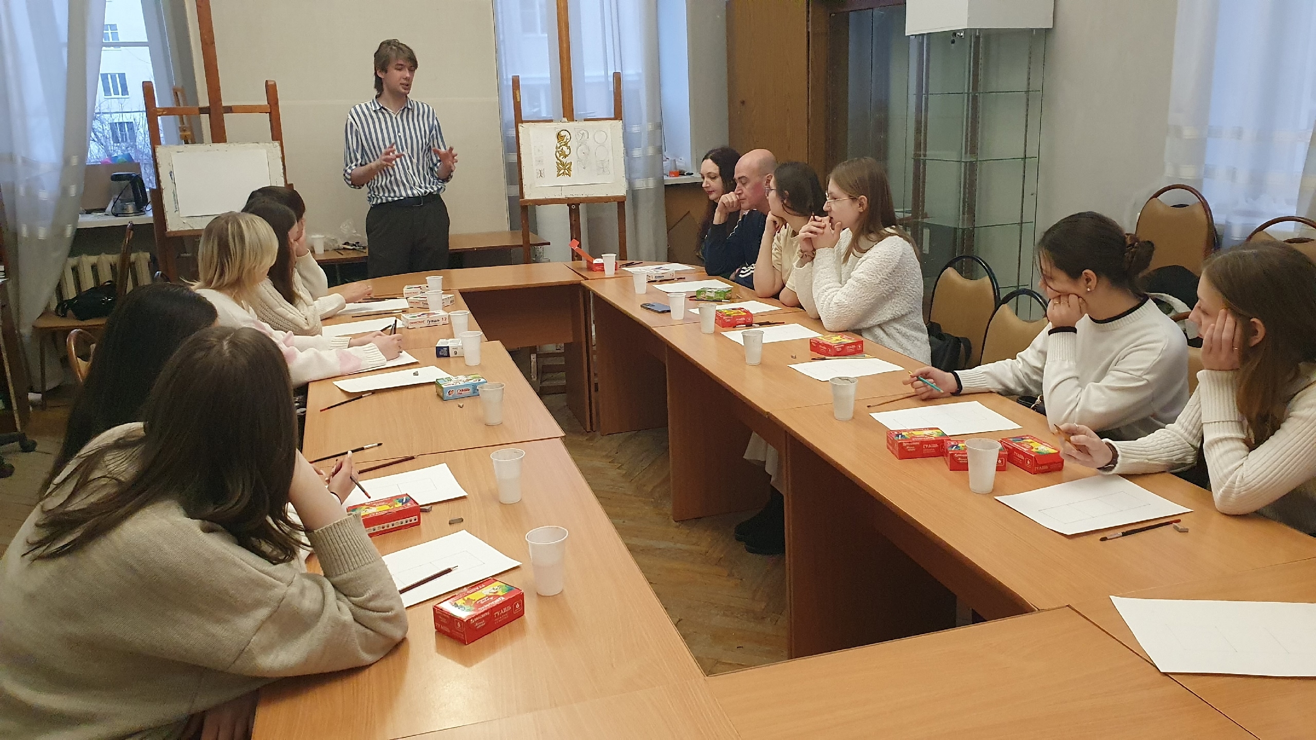 Практическая часть мероприятия состояла из мастер-классов. Часть студентов продолжила работу с Лазаревой Т.В., где на примерах конкретных произведений искусства училась видеть отражение традиций Возрождения в работах мастеров более поздних эпох и через определенные сюжетные линии и изображения пыталась сделать выводы о движениях души художников прошлого. Вторая половина группы под руководством сотрудника научно-просветительского сектора музея Владислава Романовича Барабанщикова знакомилась с орнаментом в стиле эпохи Ренессанса, пробуя с помощью цветовой палитры и различных изобразительных приемов «оживить» рисунок и придать ему визуальный объем.
