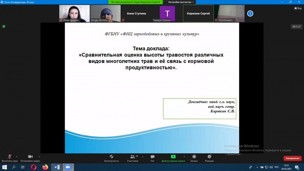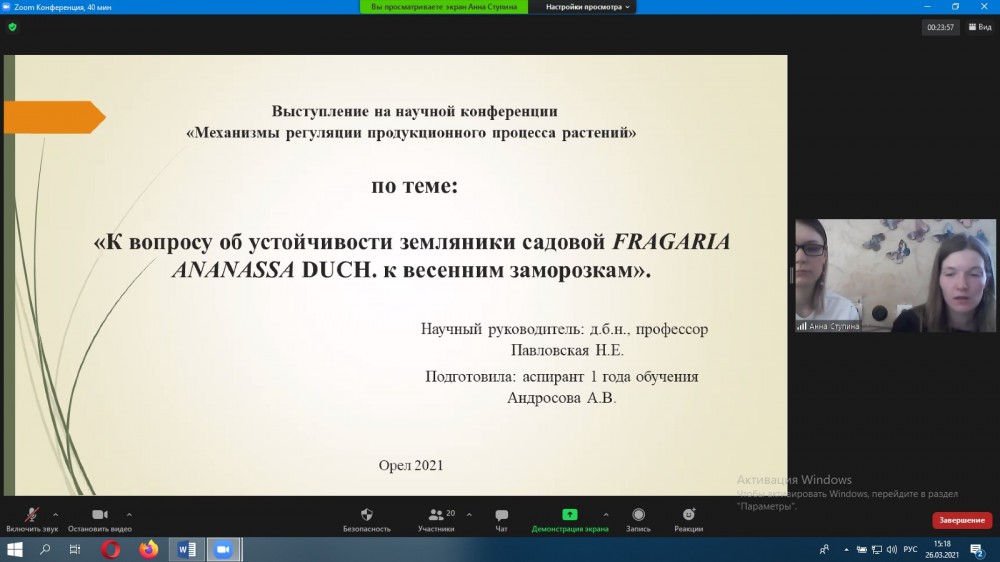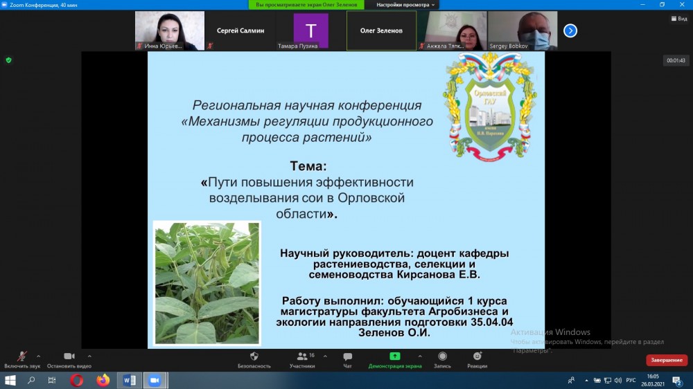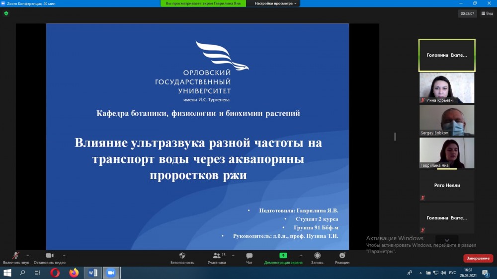 26 марта 2021 года на базе кафедры ботаники, физиологии и биохимии растений состоялось очередное собрание членов Орловского отделения общества физиологов растений, которое проходило в рамках региональной научной конференции «Механизмы регуляции продукционного процесса растений», проводимых с применением дистанционных технологий.