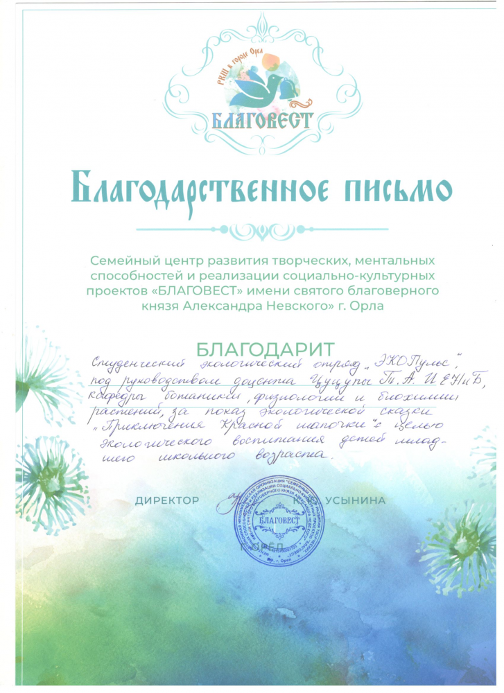 Студенческий экологический отряд «Экопульс» под руководством к.б.н., доцента Цуцупы Т.А. вновь отправился на гастроли. 28 октября состоялось представление экологической сказки «Приключения Красной Шапочки» для школьников начальных классов семейного центра развития творческих, ментальных способностей и реализации социально-культурных проектов «Благовест» имени святого благоверного князя Александра Невского г. Орла.