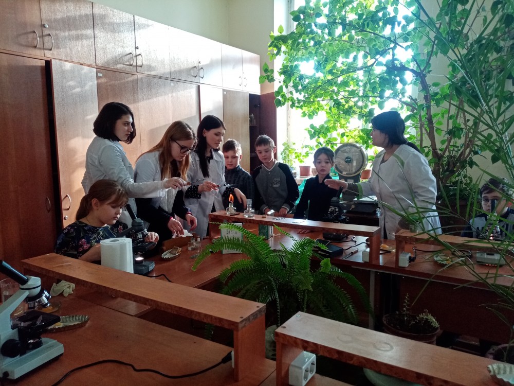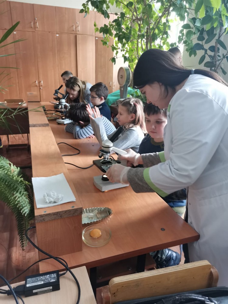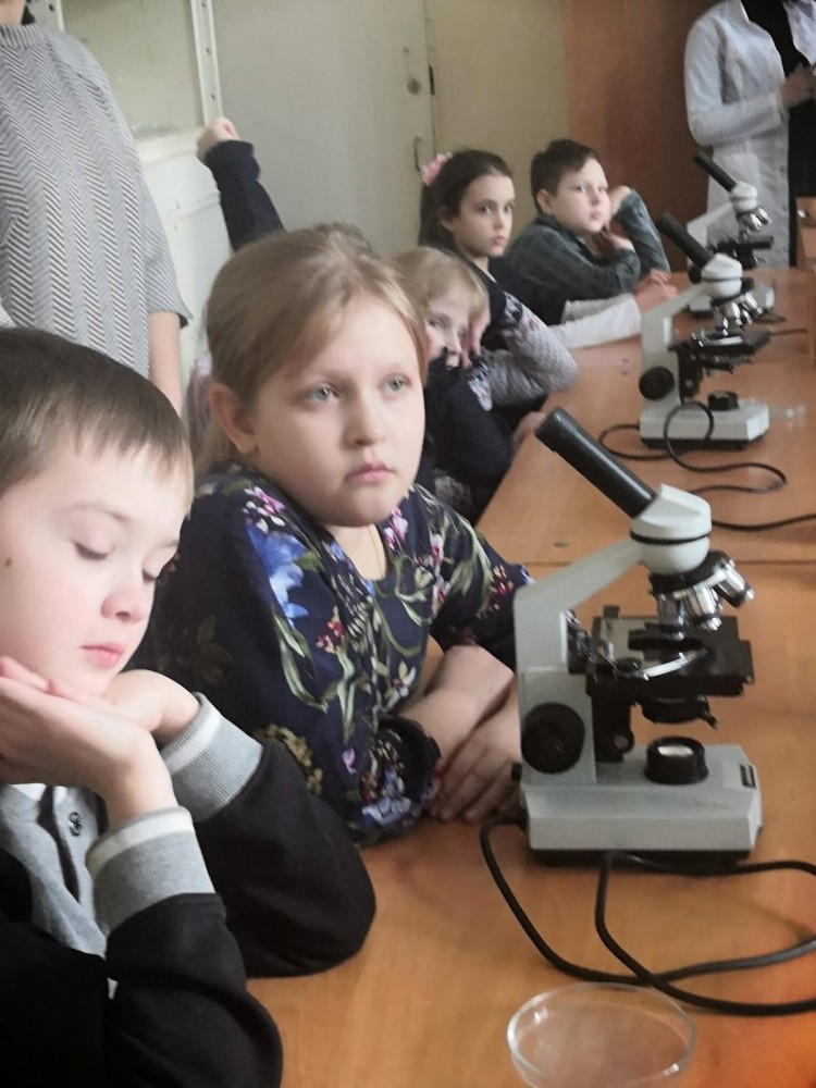 Школьники познакомились с клеточным строением животных, растений, гибов и бактерий. Ребятам были продемонстрированы и крупные клетки, которые видны без микроскопа (куриное яйцо, дольки апельсина) и микроскопические клетки (бактерии). Кроме того, гости практического семинара смогли сравнить структуру многоклеточных (пресноводная гидра, кровь человека, стебель клевера, водоросль кладофора) и одноклеточные организмов (инфузории, диатомовые и одноклеточные зеленые водоросли).
