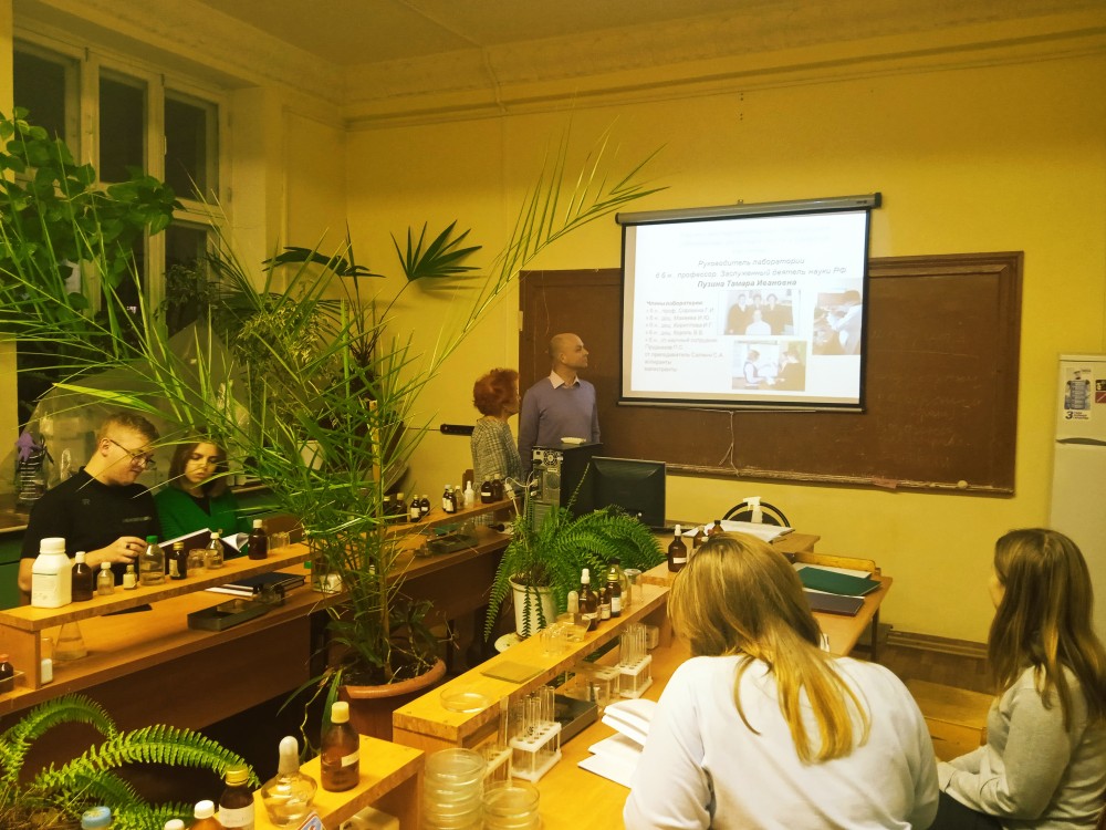 Руководитель лаборатории профессор Пузина Т.И. рассказала об истории лаборатории, у истоков которой стояли: профессор Ефремов С.И., профессор Сорокина Г.И., а также вкладе профессора Якушкиной Н.И. в развитие фитогормонального направления исследований лаборатории. Детально охарактеризована тематика научных исследований. Особое внимание было уделено проектной деятельности и перспективному фундаментальному направлению – роли вторичных метаболитов в растительном организме в зависимости от структурного состояния тубулинового цитоскелета. Показано участие студентов в научных исследованиях лаборатории. Обсудили тематику ВКР магистрантов в рамках исследований, проводимых в лаборатории.