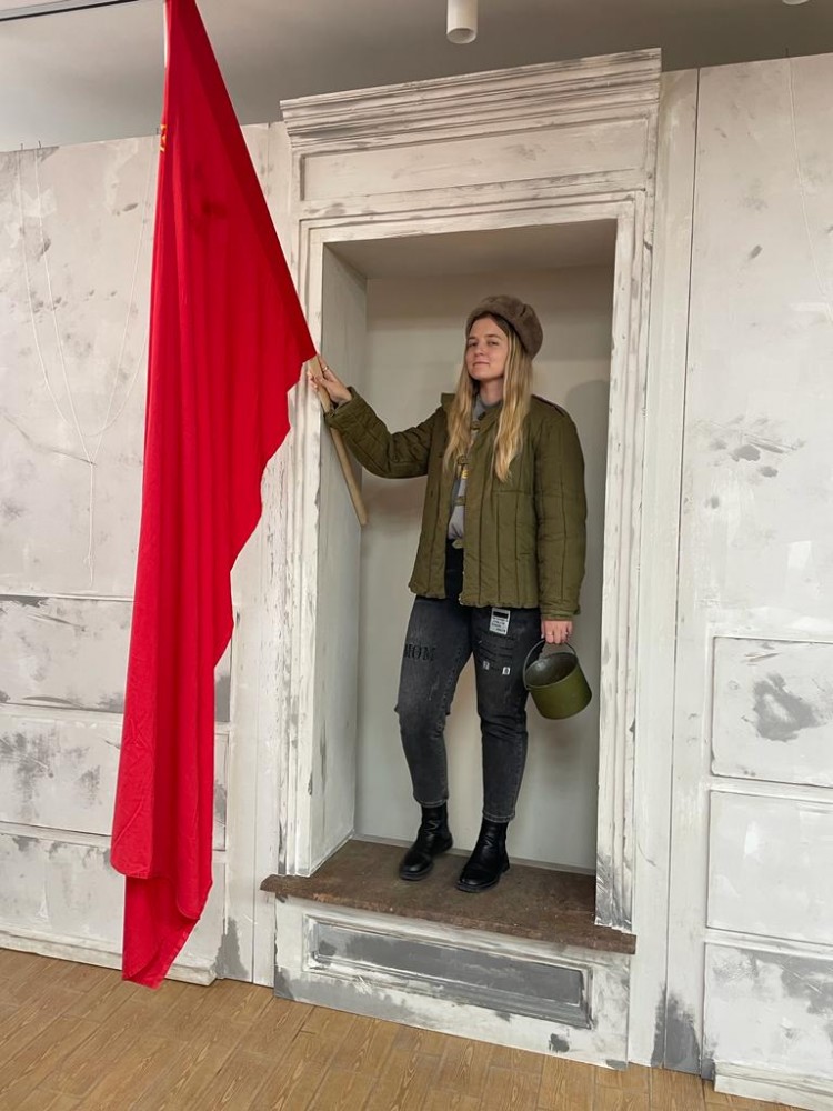 Студенты не упустили возможности потрогать и сфотографироваться в обмундировании и с оружием ВОВ.