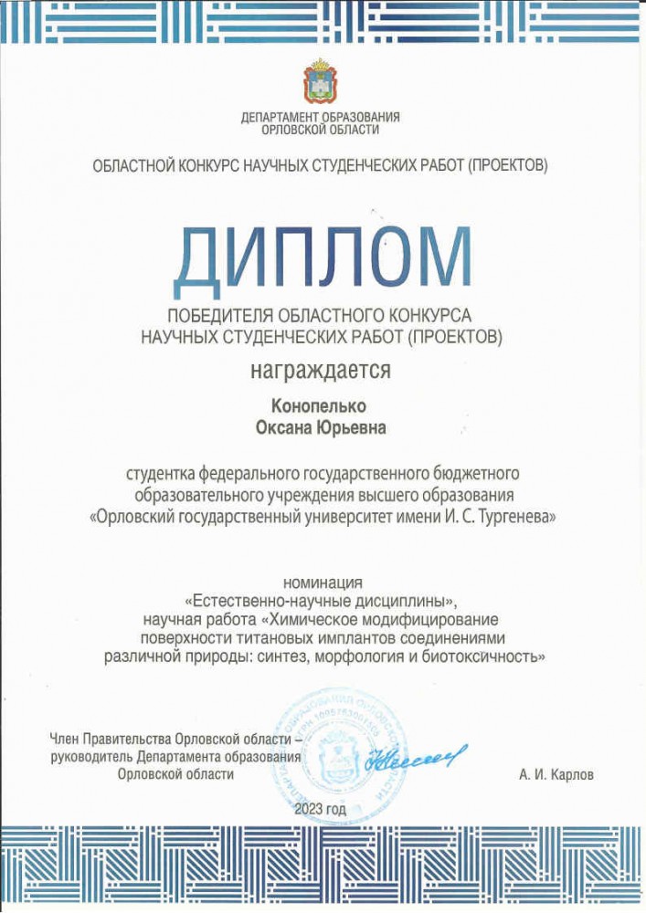 Поздравляем Оксану Конопелько, магистранта кафедры химии с победой в областном конкурсе научных студенческих работ в номинации «Естественно-научные дисциплины». Работа Оксаны «Химическое модифицирование поверхности титановых имплантов соединениями различной природы: синтез, морфология и биотоксичность» (рук. к.х.н., Грибанов Е.Н.) направлена на разработку новых композиционных нанопокрытий для титановых имплантов, способствующих более быстрой интеграции имплантата в костную ткань и уменьшению вероятности его отторжения организмом. Данная работа выполнена при поддержки стратегического партнера кафедры химии компании «Смарт Титан» (г. Москва), специализирующейся на разработке и производстве протетических супраструктур, титановых конструкций для дентальных имплантаций.
