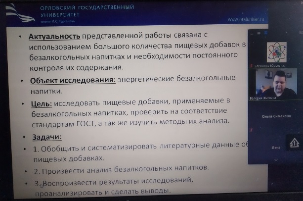 23 апреля 2020 г. в рамках общеуниверситетской недели науки на базе кафедры химии института естественных наук и биотехнологии состоялось онлайн-заседание секции «Химия», ориентированной на будущих специалистов, обучающихся по соответствующим направлениям подготовки. Конференция продолжалась 2 часа и в ее работе приняли активное участие 30 студентов 2, 3, 4 курсов направления подготовки 04.03.01 Химия, профиль Аналитическая химия, 1 и 2 курсов направления подготовки 04.04.01 Химия, профиль Аналитическая химия, а так же студенты 5 курса направления подготовки 44.03.05 Педагогическое образование, профиль Биология и химия. В работе конференции со стендовым докладом принял участие учащийся 9 класса, СОШ №2 г. Орла, который является слушателем ЮСНИШ «Основы нанохимии» Дорофеев Д.Ю. Руководили работой секции к.х.н., доц.Симакова О.Е. и к.х.н., доц. Юшкова Э.Ю.