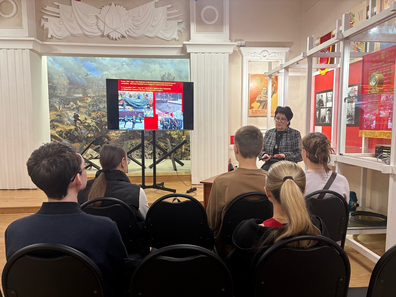 26.11.2025. В ходе реализации проекта «Великая Отечественная война в воспоминаниях потомков героев», в целях популяризации культурных и гражданско-патриотических мероприятий среди учащейся молодежи ответственные за выполнение проекта, доценты кафедры географии, экологии и общей биологии О.В. Руденко, Л.Н. Трофимец и Е.А. Санкова, организовалидля студентов направлений подготовки 05.03.02 География (группы 51Г) и 44.03.05 Педагогическое образование (группы 51ПГО б/г)экскурсию в областной Краеведческий музей для осмотра экспонатов музея, посвященных Великой Отечественной войне, и встречи со старшим научным сотрудником научно-исследовательского отделамузея Ириной Юрьевной Скрюченковой. На встрече И.Ю. Скрюченкова представила замечательный музейный урок-презентацию «Мы помним…», посвященную Дню памяти Неизвестного солдата. Главная цель мероприятия - не дать забыть новым поколениям, кто и какой ценой выиграл самую страшную войну прошлого века. Историческая память — это не просто уроки прошлого. Это фундамент, на котором строится наше будущее