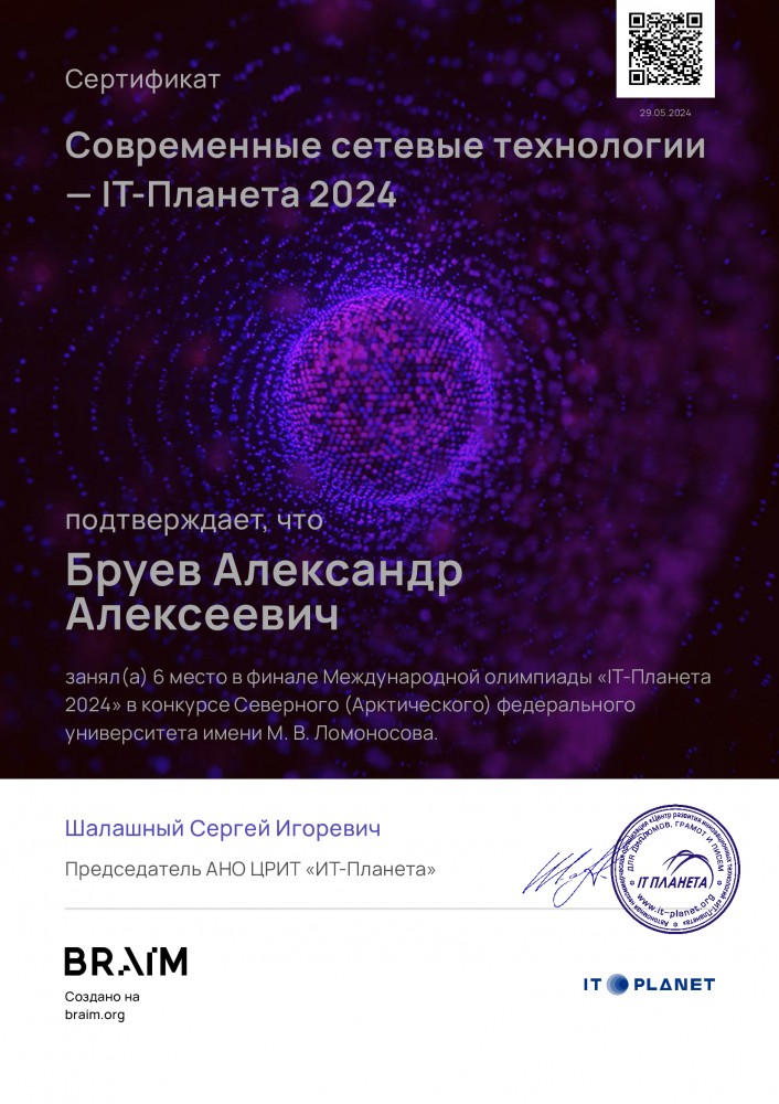 Церемония открытия олимпиады прошла 23 мая в IT-парке «Цифровая Арктика», организованном для проведения мероприятия в сотрудничестве с партнером олимпиады – Северным (Арктическим) федеральным университетом (САФУ). В этот же день прошел финал олимпиады по номинации «Современные сетевые технологии», в ходе которого Александр Бруев соревновался с лучшими из молодых специалистов со всей России. Работа над заданием финала заняла 5 часов и проходила с применением реального оборудования, а также современных практик разработки программного обеспечения и сетевых технологий (Kubernetes, Grafana, CI/CD), при этом с использованием отечественного и свободного программного обеспечения.