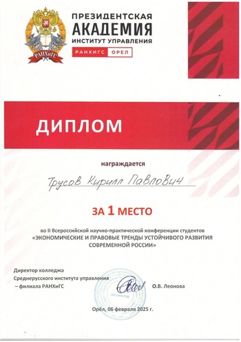 6 февраля 2025 г. студенты факультета СПО приняли участие во II Всероссийской научно-практической конференции "Экономические и правовые тренды устойчивого развития современной России", которая прошла в колледже Среднерусского института управления - филиала РАНХиГС!