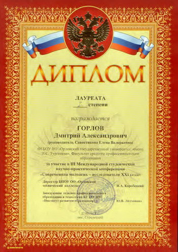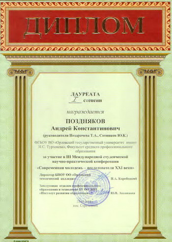 22 марта студенты факультета СПО вместе с преподавателем кафедры гуманитарных и естественнонаучных дисциплин Е.А. Аношиной приняли участие в III-й Международной студенческой научно-практической конференции «Современная молодежь – исследователи XXI века» на базе Орловского технического колледжа.