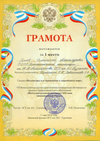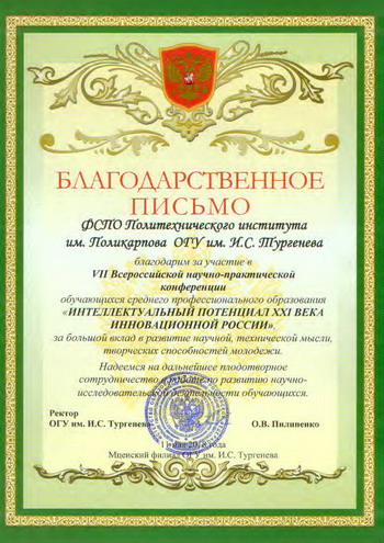 Успехом завершилась участие студентов факультета в VII-ой Всероссийской научно-практической конференции обучающихся среднего профессионального образования «Интеллектуальный потенциал XXI-го века инновационной России», прошедшей 11 мая на базе Мценского филиала ОГУ имени И.С. Тургенева – 3 первых места, 5 вторых мест и 4 третьих места.