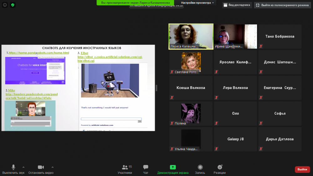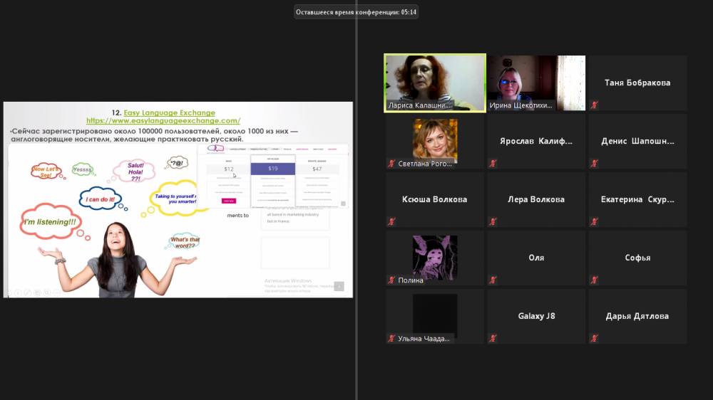 На мероприятие были приглашены школьники, интересующиеся изучением английского языка, в том числе учащиеся Гимназии № 1 ОГУ имени И.С. Тургенева. Их познакомили с языковыми платформами, размещенными в сети интернет и используемыми в качестве онлайн технологий для обучения английскому языку. Всего было продемонстрировано 15 платформ и 6 чат-ботов. Основное внимание было уделено наиболее эффективным и доступным платформам и их возможностям, проведен анализ их достоинств и недостатков (LearnEnglish, Busuu, Omegle, Babbel, LingQ, Easy Language Exchange, My Language Exchange, SharedTalk, Interpals, English, Baby! и др.).