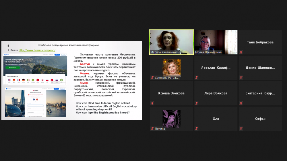 2 ноября 2021 года в рамках Всероссийского Фестиваля науки NAUKA 0+, посвященного Году науки и технологий Российской Федерации, профессором кафедры английского языка Л.В. Калашниковой была проведена лекция-презентация на тему «Использование языковых платформ в качестве онлайн технологий для обучения английскому языку».