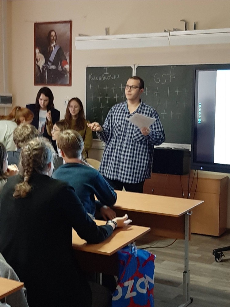 24 октября в рамках Всероссийского Фестиваля Nauka 0+, а также с целью развития психологической готовности студентов института иностранных языков к профессиональной деятельности студенты 1 курса Пронина Валерия, Прилепская Ольга, Полухин Роман, Сидорова Виктория и Титенок Елена совместно с преподавателями Лемешевой Е.П. и Макаровой Е.Л провели мероприятие в Гимназии №1 ОГУ имени И.С. Тургенева. Для учащихся 10 классов был организован конкурс-викторина «Эрудит».