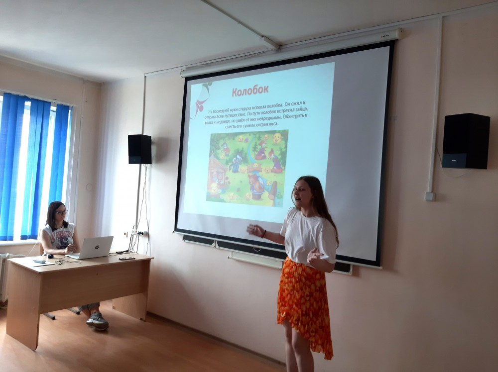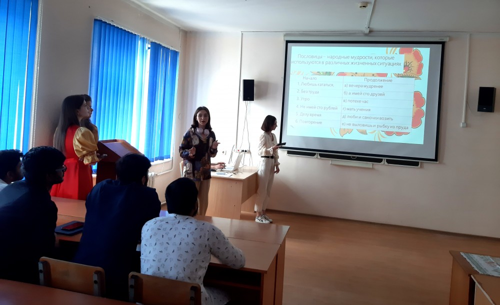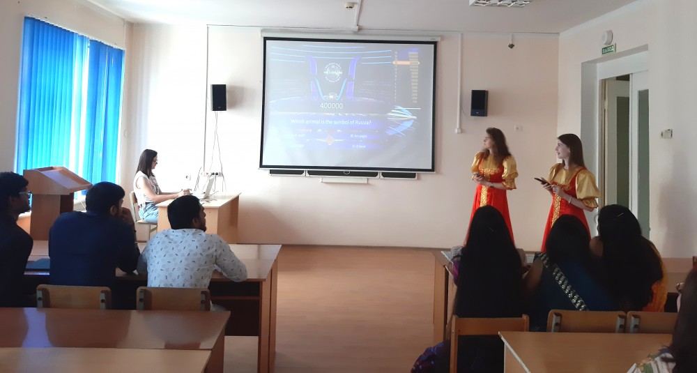 Презентация России прошла в форме увлекательного путешествия по страницам русских народных сказках, интересных викторин и загадок и задорного мастер-класса «Русская частушка». Все эти испытания и развлечения для иностранных студентов были подготовлены учащимися групп 11 и 21 ЛНГ. Мы были приятно удивлены тем, что наши зарубежные друзья с энтузиазмом выполняли все задания, демонстрируя довольно хороший уровень знания реалий русской культуры, истории и географии.