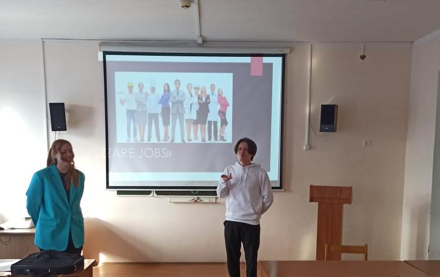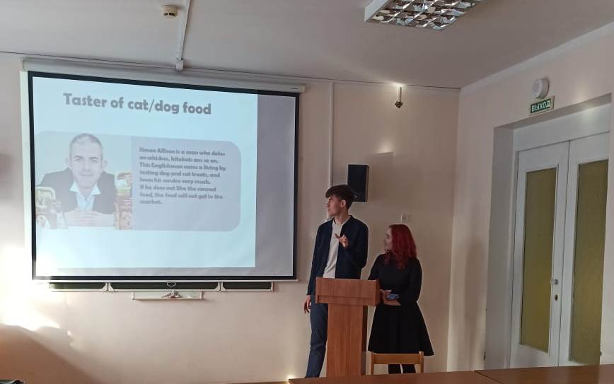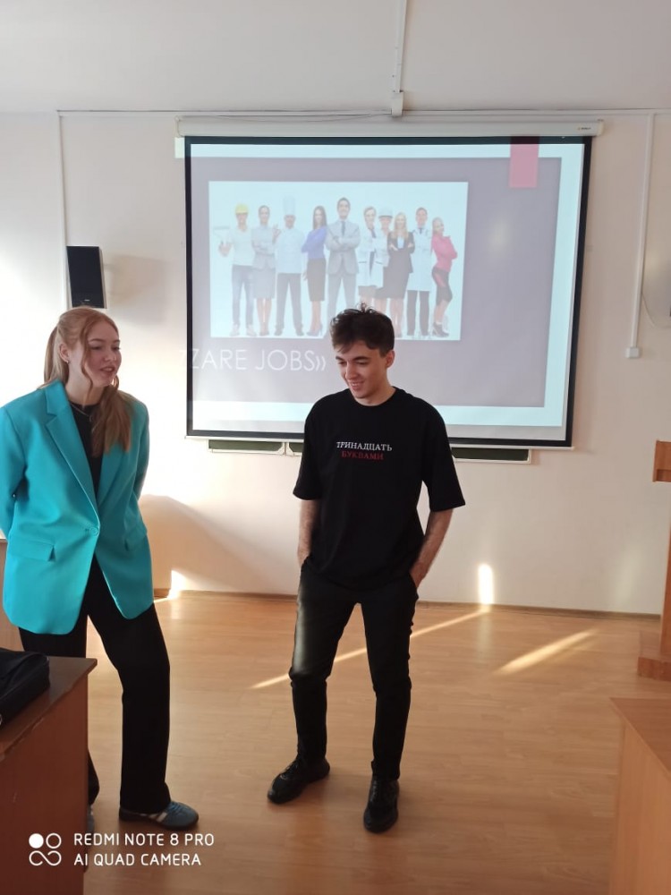 Студенты групп 21ПГО, 21ЛНГ, 22ЛНГ представили свои презентации о самых необычных работах в мире «Bizarre jobs», участвовали в играх-конкурсах. Ведущие Сидорова Виктория и Тучкова Ангелина предложили участникам описать профессию не называя ее, остальные должны были угадать ее, также были задания изобразить работу (в формате игры «Крокодил») и угадать ее, что вызвало большой энтузиазм аудитории, а также вспомнить как можно больше пословиц и поговорок, связанных с понятиями «работа» и «труд». В конце программы студенты обсудили в группах критерии понятия «работа мечты», представили на общее обсуждение свои аргументы и выводы, сравнивая их.