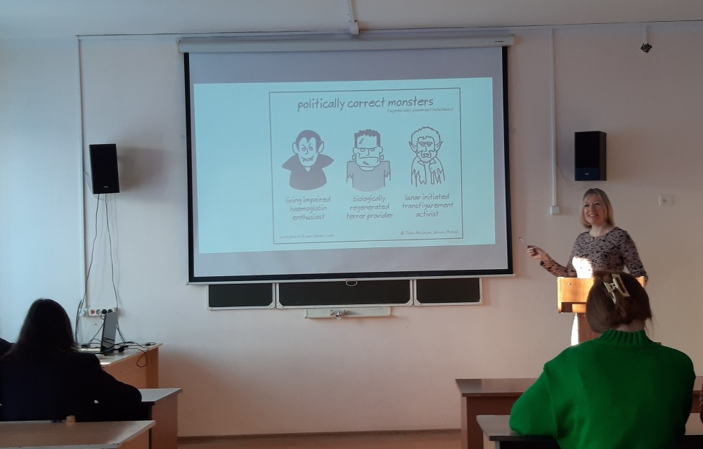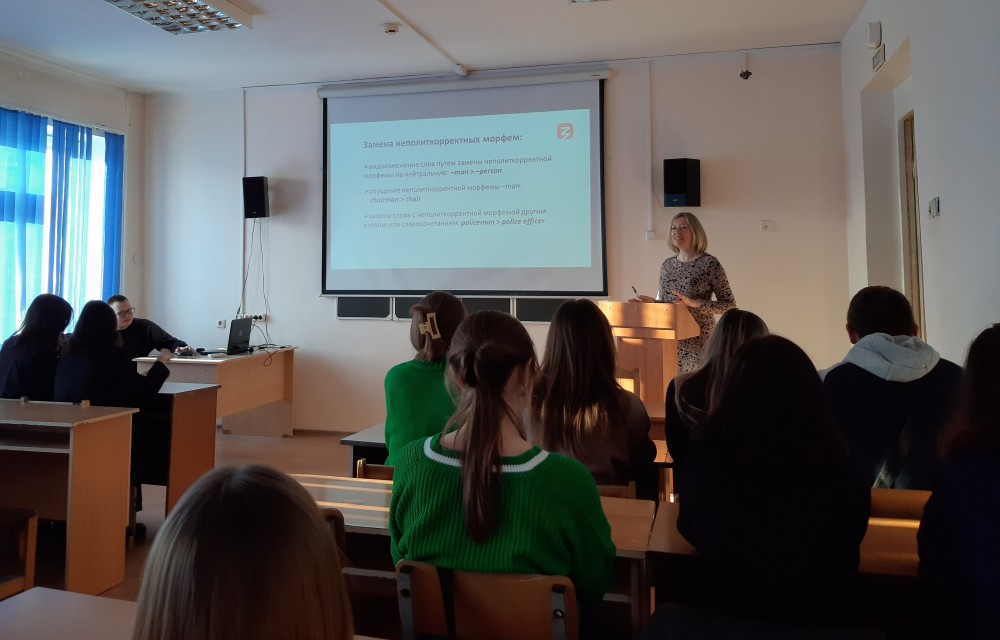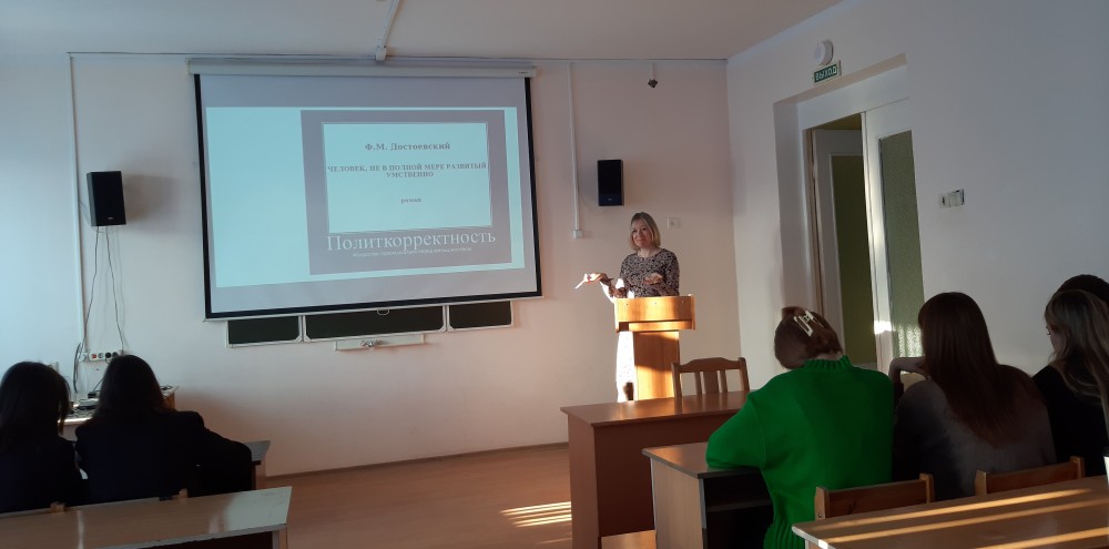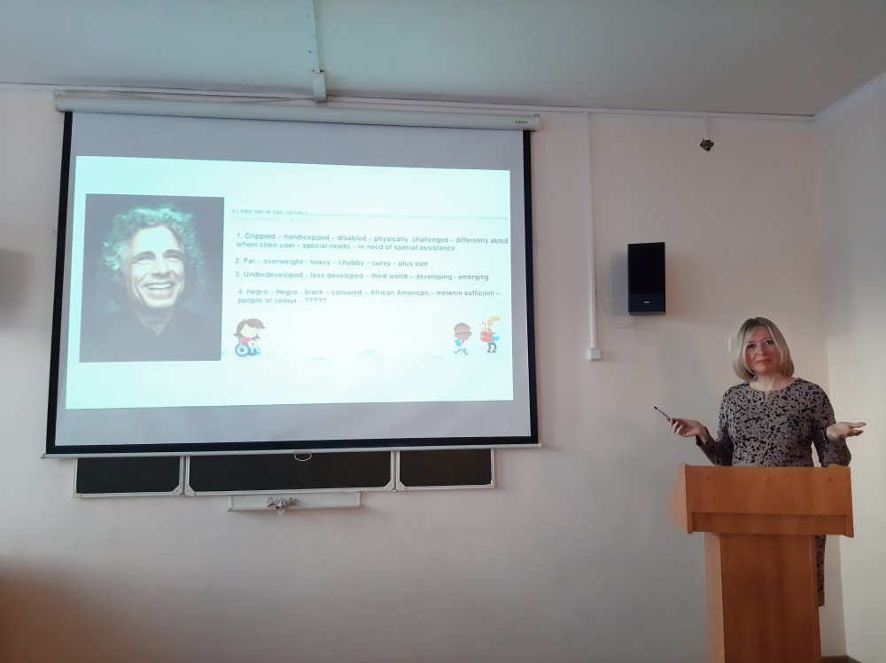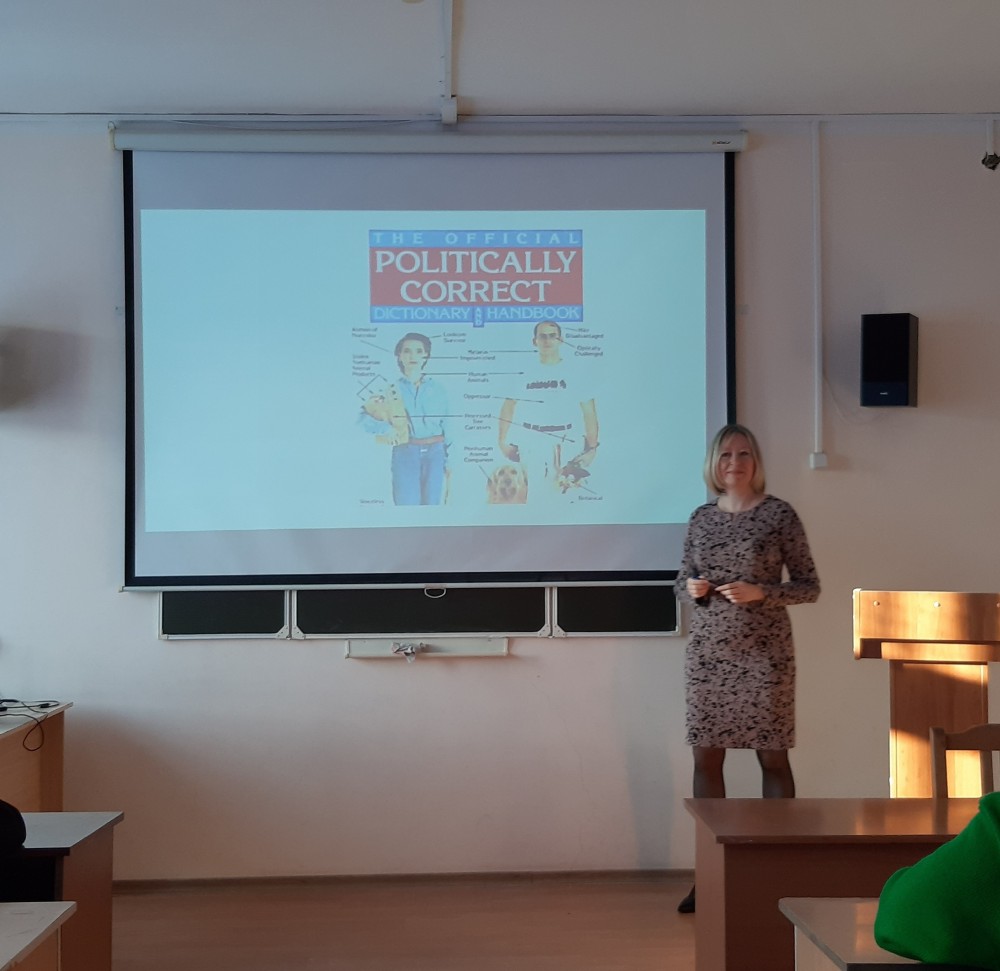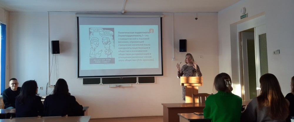 04 декабря 2023 года лекцию на эту тему прочитала зав. кафедрой английского языка И.Н. Щекотихина в рамках открытого лектория общества «Знание». Она рассказала будущим лингвистам и специалистам в области межкультурной коммуникации о сути данного феномена, рассмотрела вопрос о георафии и причинах его возникновения, показала его основные аспекты и сферы реализации, познакомила студентов со способами образования политкорректных единиц/форм и обсудила с ними позитивные и негативные стороны этого явления, приведя аргументы современных ученых, публицистов и писателей и проанализировав примеры чрезмерной (порою доведенной до абсурда) языковой политкорректности.