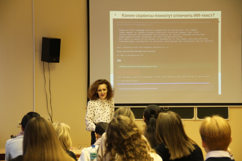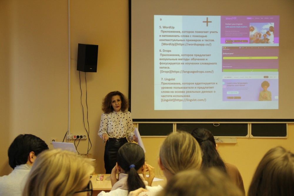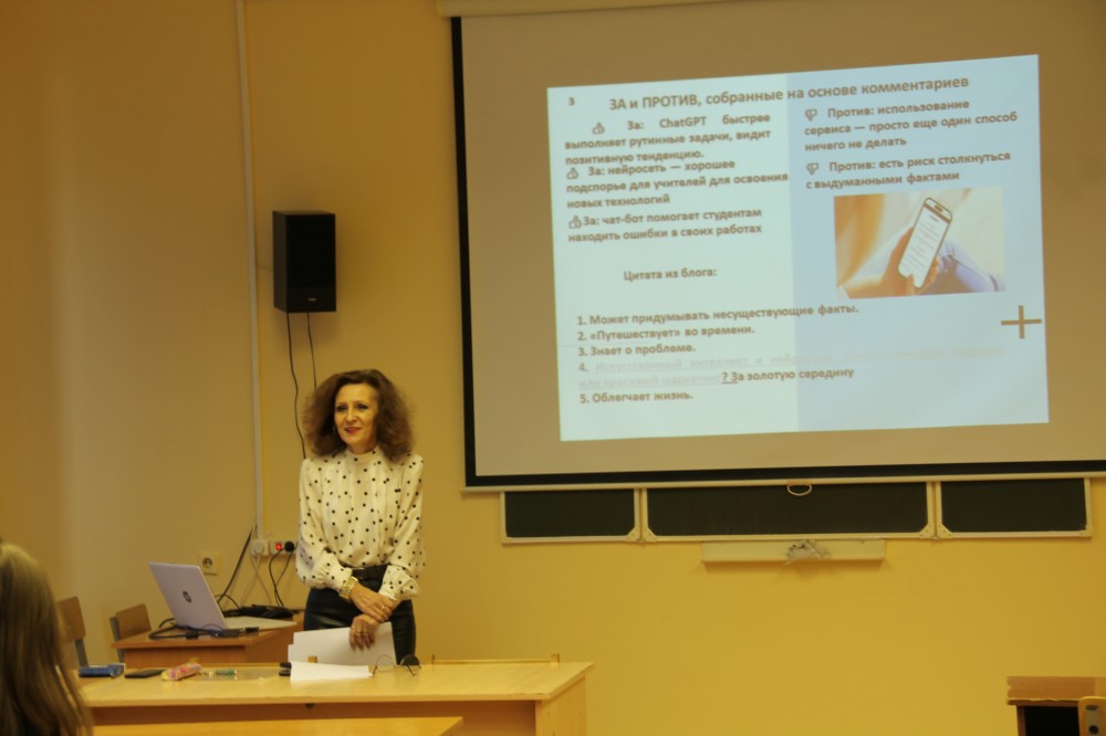 12 декабря в рамках открытого лектория общества «Знание» профессором кафедры Калашниковой Л.В. была прочитана лекция на тему «Может ли ИИ помочь в изучении иностранных языков?». Слушатели, студенты групп 41 ПГО, 42 ПГО и 43 ПГО, познакомились с возможностями ИИ в качестве помощника для изучения иностранных языков. Тема вызвала большой интерес у аудитории, которая активно задавала вопросы.
