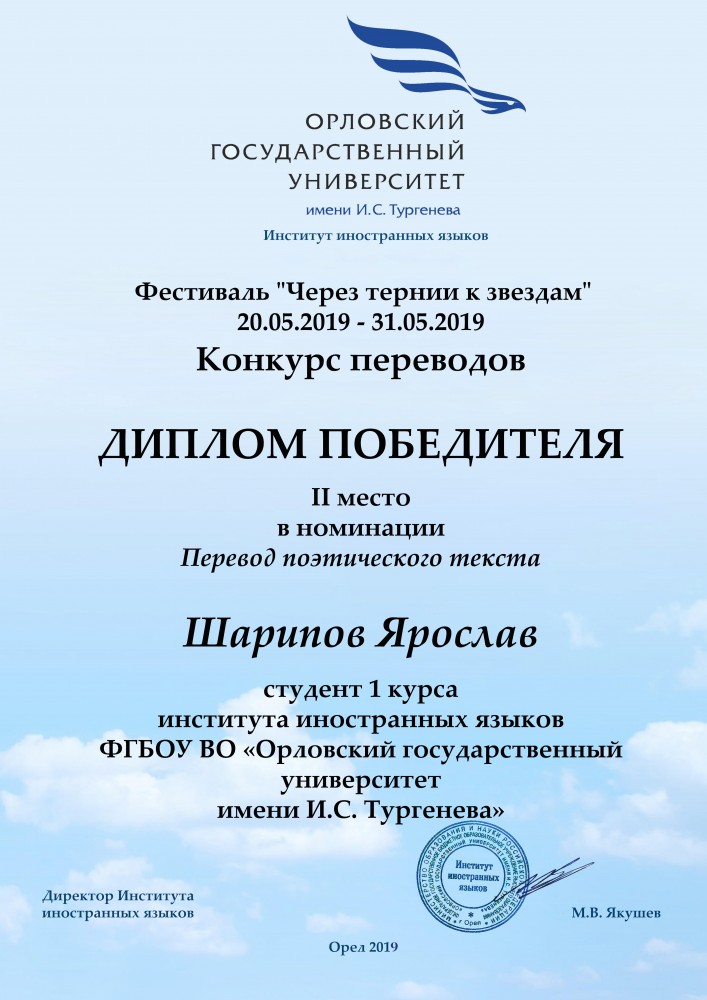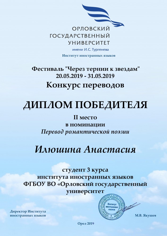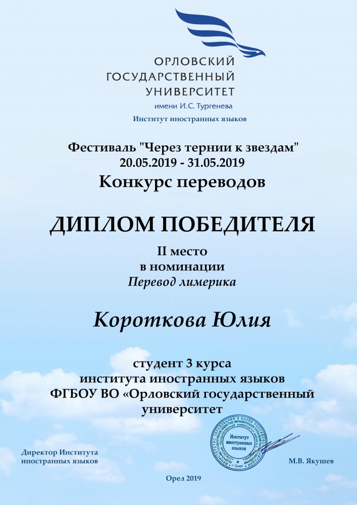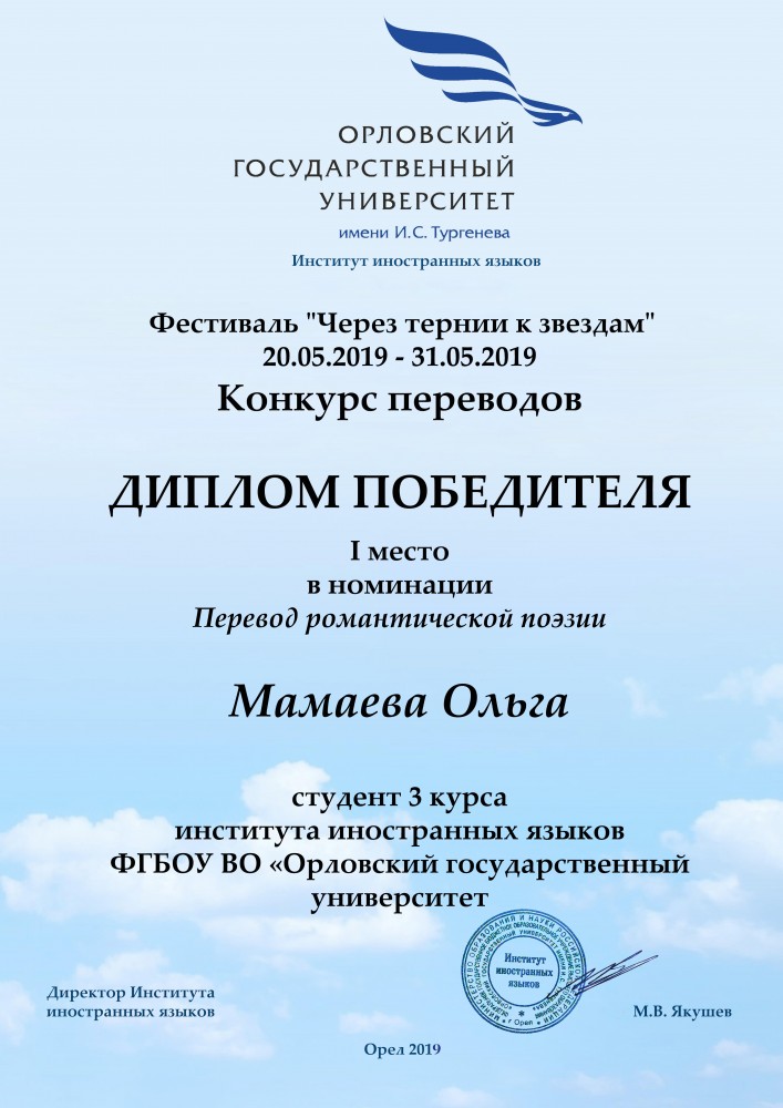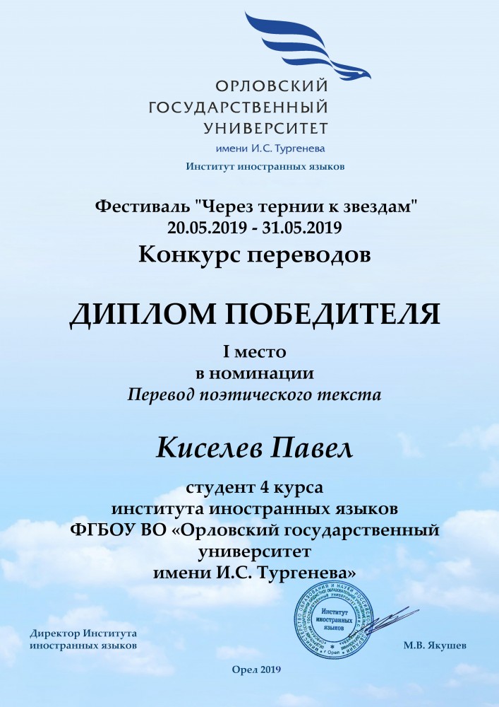 Победители Конкурса переводов в рамках Фестиваля "Через тернии к звездам" (20.05.2019 - 31.05.2019) ИИЯ английское отделение. В номинации Перевод поэтического текста - Киселев Павел студент 4 курса (гр.111502) 1 место, Шарипов Ярослав студент 1 курса (81 ЛНГ) - 2 место. В номинации Перевод лимерика: Никулина Татьяна студент 3 курса - 1 место, Короткова Юлия студент 3 курса - 2 место, Берлова Елизавета студент 4 курса - 3 место, в номинации Перевод романтической поэзии - Мамаева Ольга студент 3 курса - 1 место, Илюшина Анастасия студент 3 курса - 2 место.