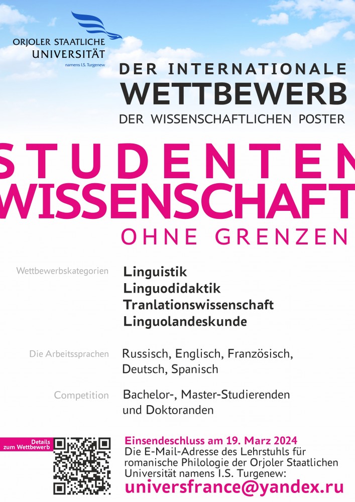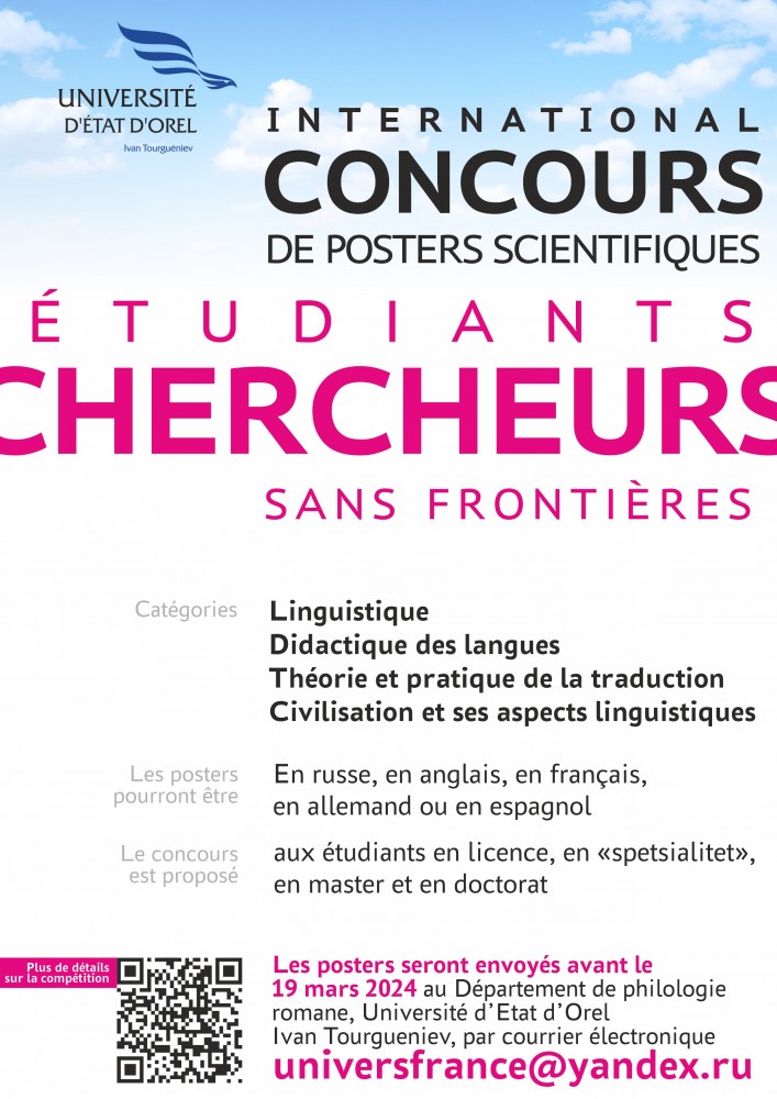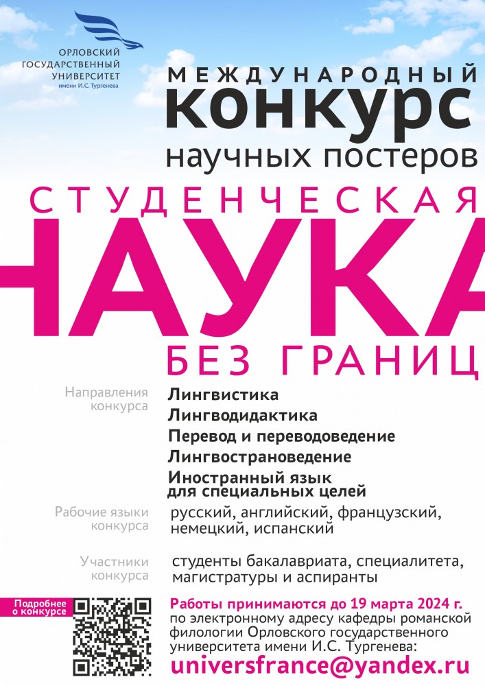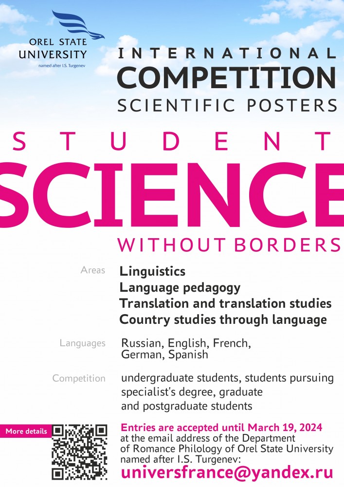 Кафедра романской филологии Института иностранных языков приглашает студентов бакалавриата, специалитета, магистратуры и аспирантов принять участие в V Международном конкурсе научных постеров «Студенческая наука без границ»