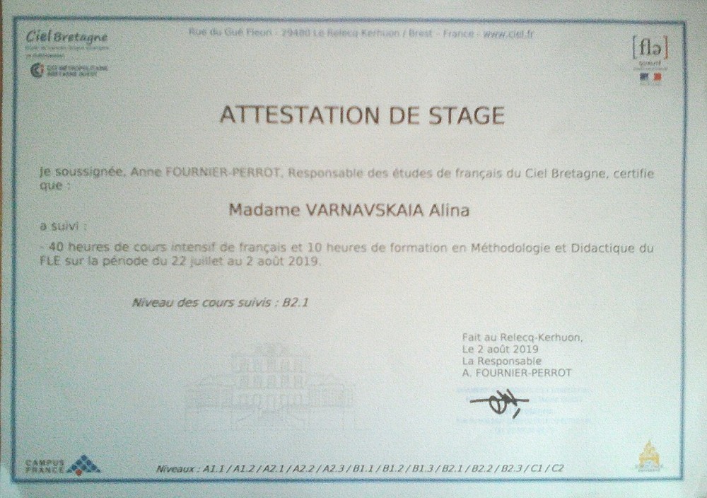 Начиная с принимающей семьи, благодаря которой я имела возможность взглянуть на повседневную жизнь местных жителей, заканчивая грамотно организованными занятиями в центре CIEL Bretagne, все вокруг способствовало совершенствованию языковых компетенций и получению новых полезных знаний. Я могла наблюдать за опытными преподавателями, соблюдающими высшие международные стандарты обучения иностранному языку, и почерпнула много полезной информации, которую смогу использовать в своей профессиональной деятельности. Считаю, что это незаменимый опыт».