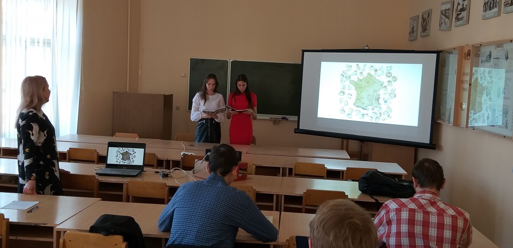 18 октября Малори Крепин была приглашена на лекцию-беседу по дисциплине «Иностранный язык региона» (преподаватель к.п.н., доцент И.А.Бирюкова) на тему «Гастрономия Франции. Сыр – эмблема нации?». Ознакомившись с результатами исследований студентов, посвященных классификациям сыра по регионам, составу и другим критериям, стажер Руанского университета Малори Крепин рассказала о способах приготовления и основных характеристиках французских сыров, используя в качестве наглядности мультимедийную презентацию.