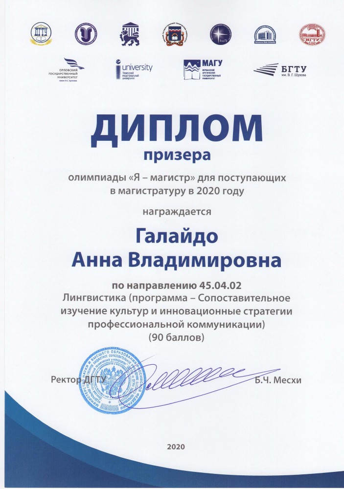 Олимпиада проходила в 2 этапа: с 25 марта по 25 апреля 2020 г. и с 13 по 30 мая 2020 г. По ее результатам наша студентка Анна Галайдо стала призером по направлению 45.04.02 Лингвистика, набрав в заключительном этапе 90 баллов.