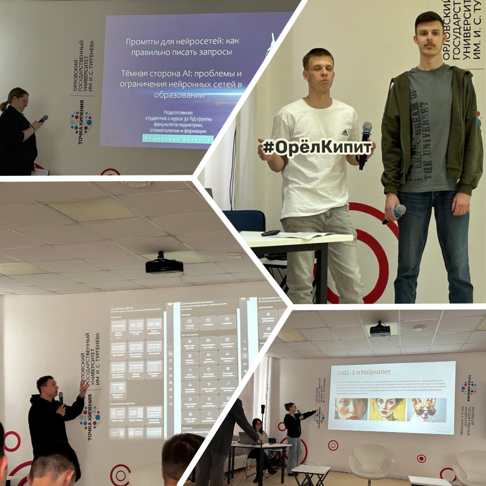 10 апреля 2025 года в Центре коллективной работы «Точка кипения ОГУ имени И.С. Тургенева» преподавателями кафедры иностранных языков Л.Е. Борисовой, Г.Ю. Гришечкиной и Е.Н. Румянцевой был организован и проведен мастер-класс «Нейросети в обучении: запретить нельзя разрешить».