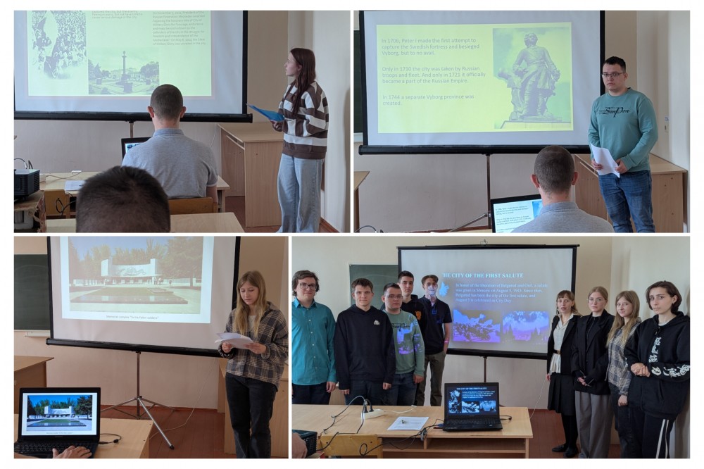 На этот раз студенты 1 курса исторического факультета под руководством старшего преподавателя кафедры иностранных языков Ю.А. Карпушиной путешествуют по городам воинской славы России, чтобы окунуться в историю, познать традиции и культуру победоносных городов. Будущие историки подготовили и обсудили интересные доклады о Белгороде, Воронеже, Выборге, Курске, Таганроге, Твери, Ростове-на Дону, о городах Российской Федерации, являющимися вечными памятниками мужества и доблести наших предков, отстоявших родную землю.