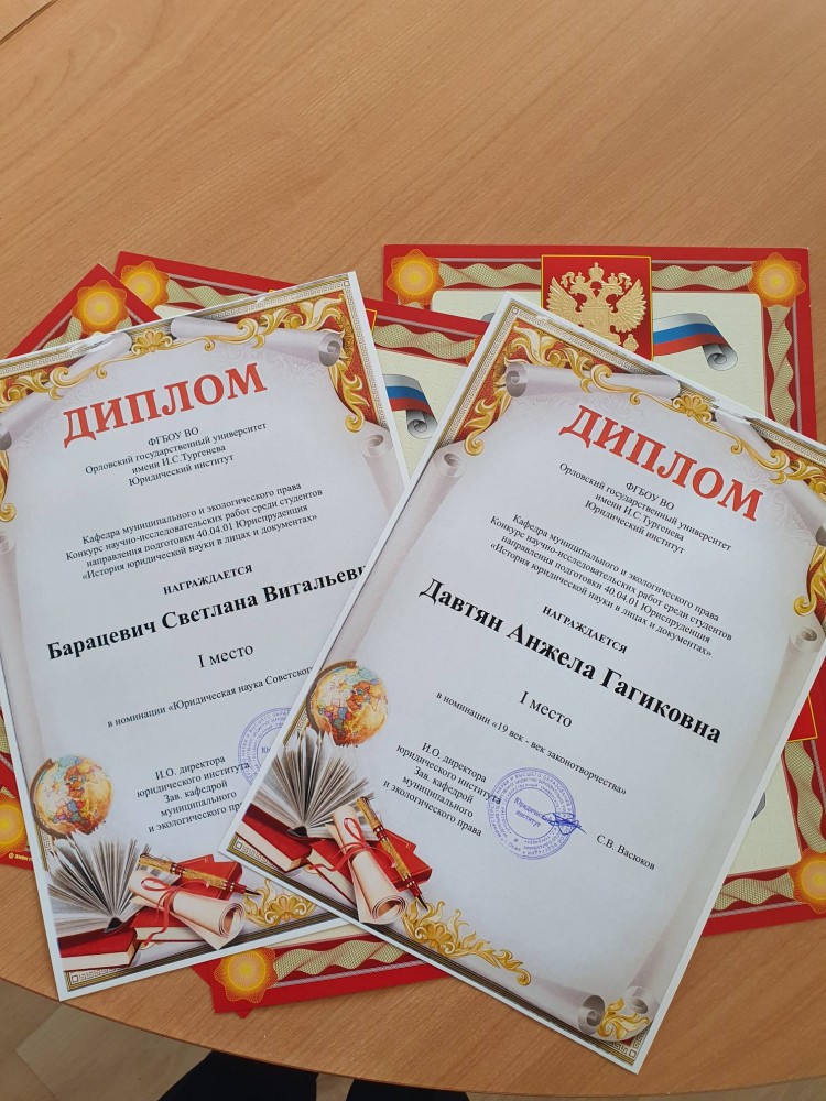 По инициативе кафедры муниципального и экологического права, а также в целях активации научно-исследовательской деятельности студентов и в соответствии с календарным планом воспитательной работы юридического института ФГБОУ ВО «Орловский государственный университет имени И. С. Тургенева» на 2023–2024 уч. год с 30 мая по 5 июня 2024 г. в юридическом институте ФГБОУ ВО «ОГУ имени И.С. Тургенева» конкурс научно-исследовательских работ среди студентов 1 и 2 курсов, направления подготовки 40.04.01 Юриспруденция «История юридической науки в лицах и документах», приуроченный 300-летию РАН, в заочной форме. Студенты приняли активное участие в конкурсе. По результатам конкурса призовые места были распределены следующим образом: