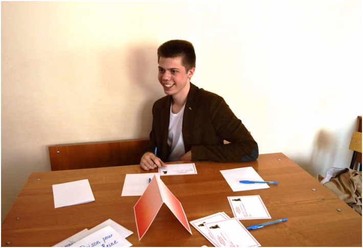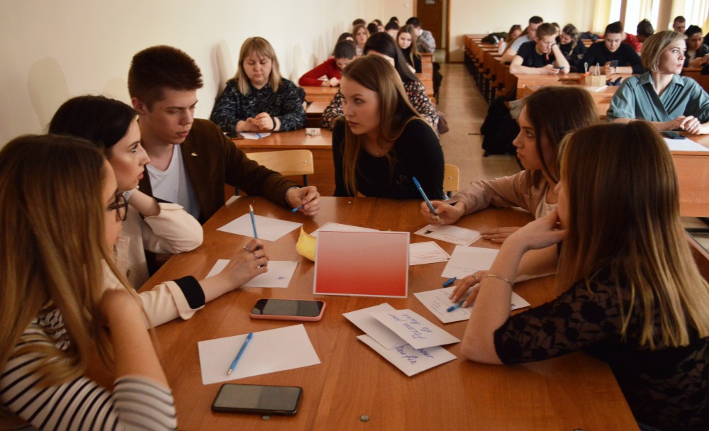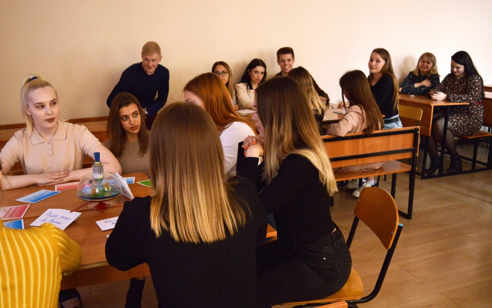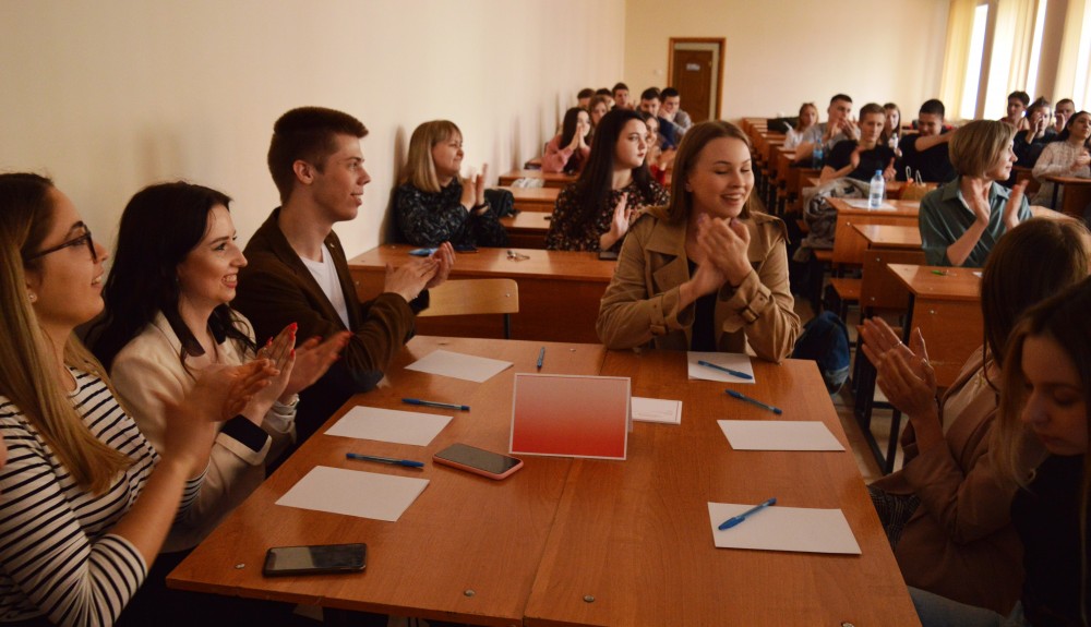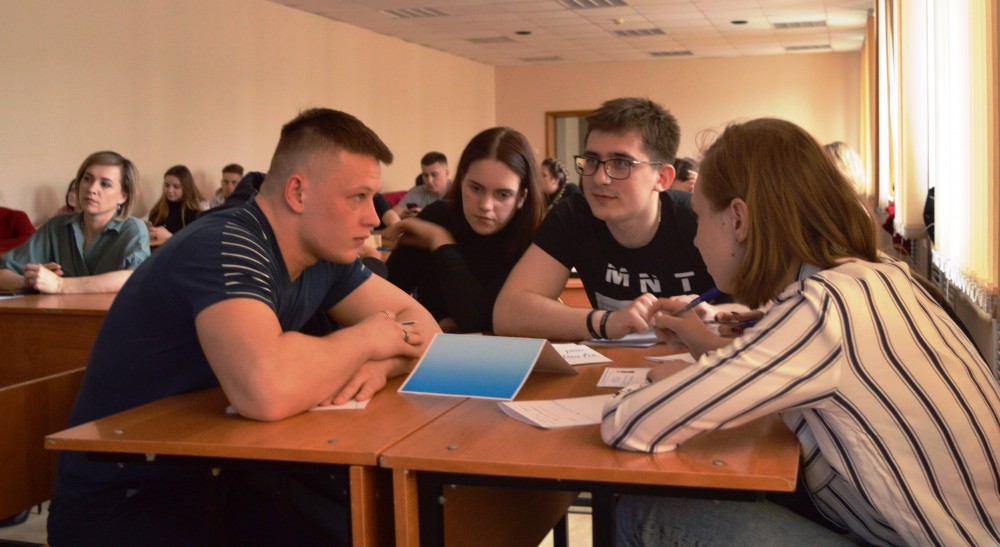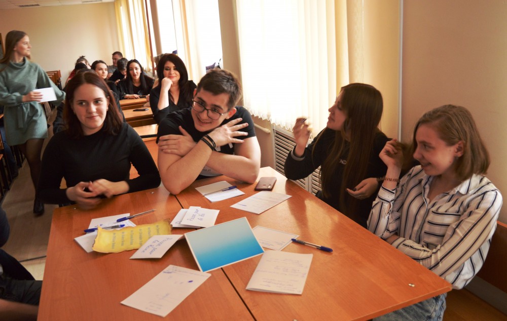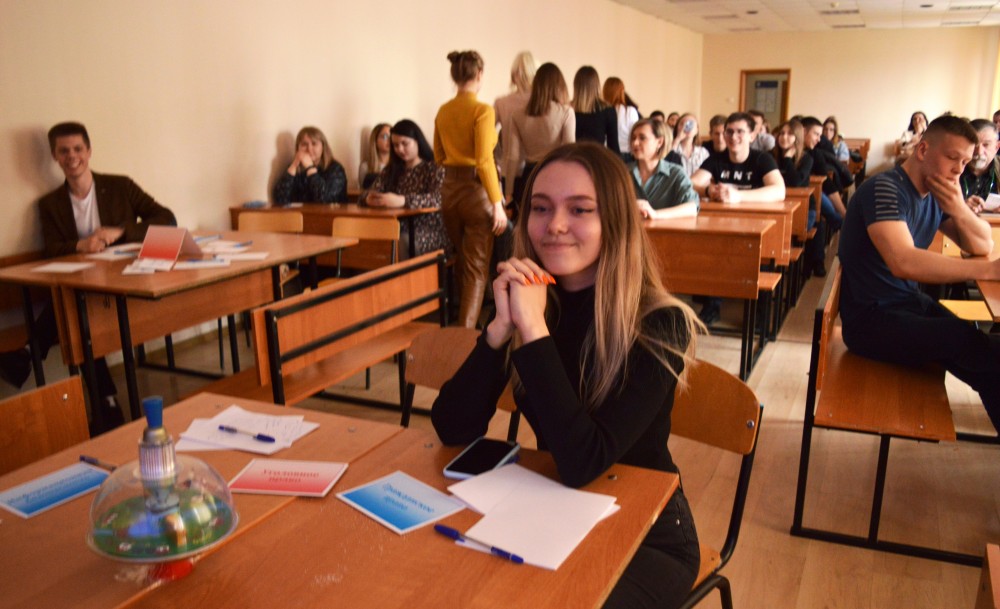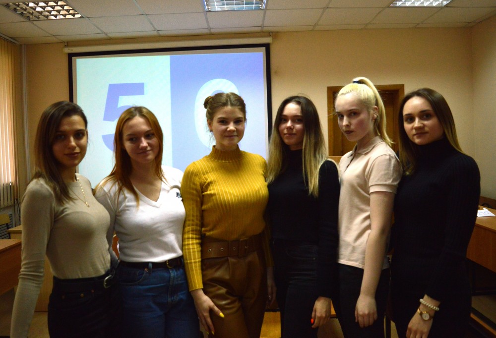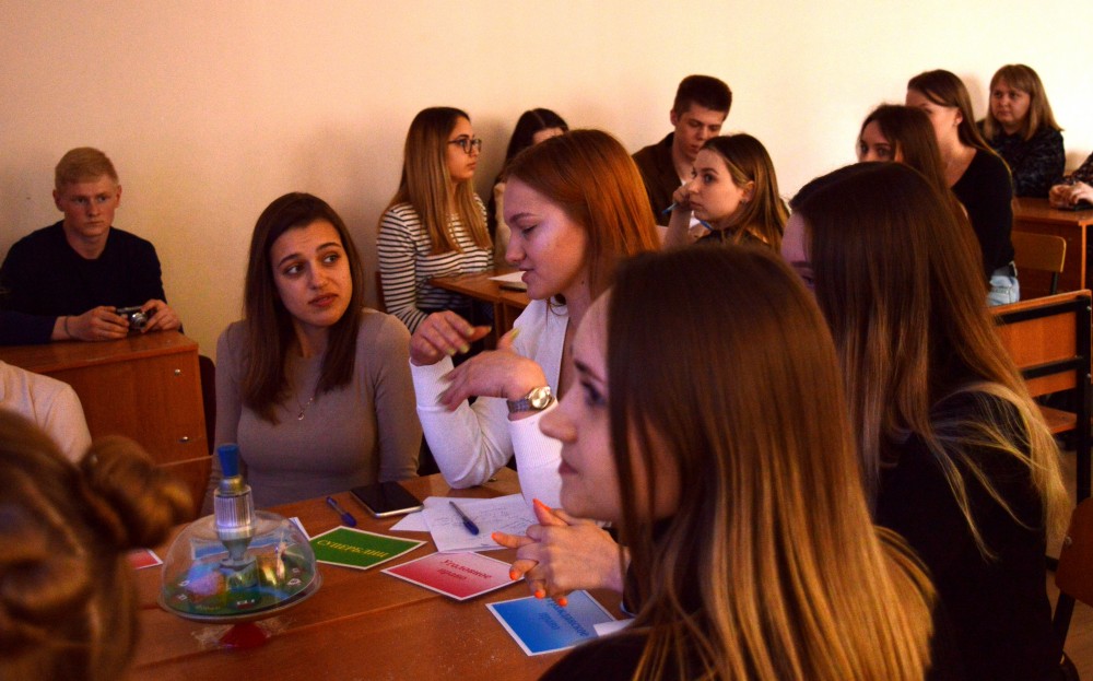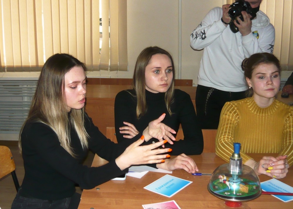 За синим игровым столом вне конкурса, но с обязательным подсчетом количества правильных ответов посредством карточек, сыграла команда 1-го курса специальности Правовое обеспечение национальной безопасности группы 01НБ в следующем составе: