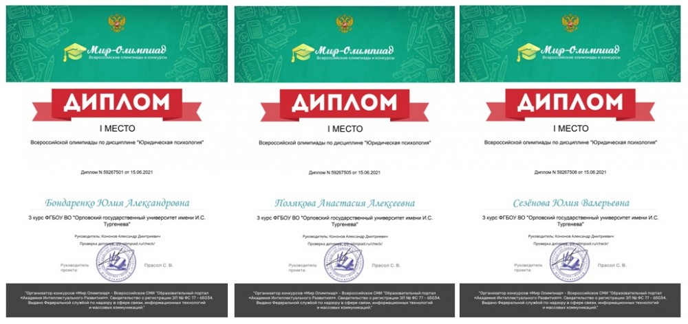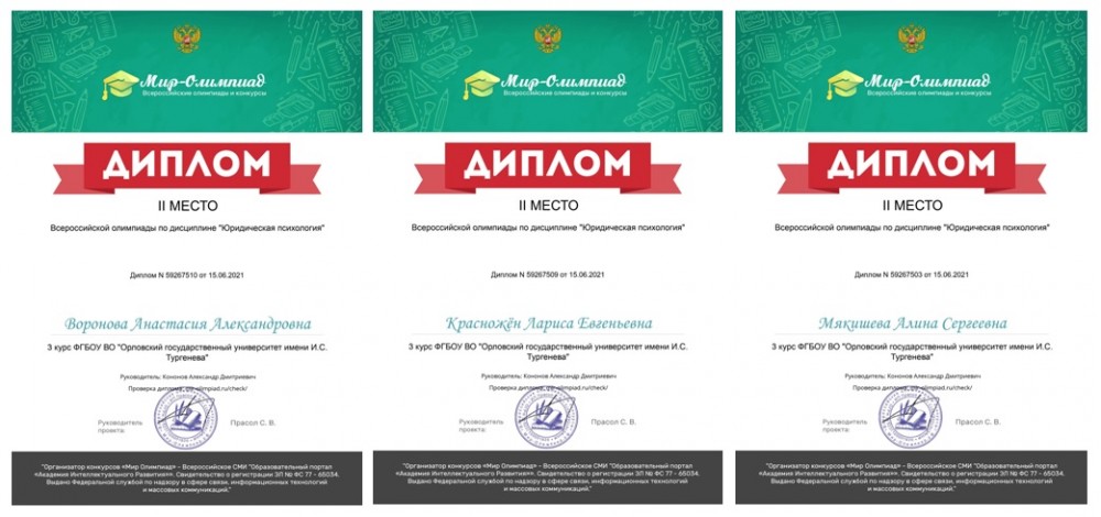 15 июня 2021 года команды студентов 3 курса, обучающихся по специальности 40.05.01 «Правовое обеспечение национальной безопасности», группы 81НБ под руководством доцента кафедры национальной безопасности, к.ю.н. Кононова Александра Дмитриевича приняли участие во Всероссийской олимпиаде по дисциплине «Юридическая психология» (Организатор конкурсов «Мир Олимпиад» – Всероссийское СМИ «Образовательный портал «Академия Интеллектуального Развития» (Свидетельство о регистрации ЭЛ № ФС 77 – 65034).
