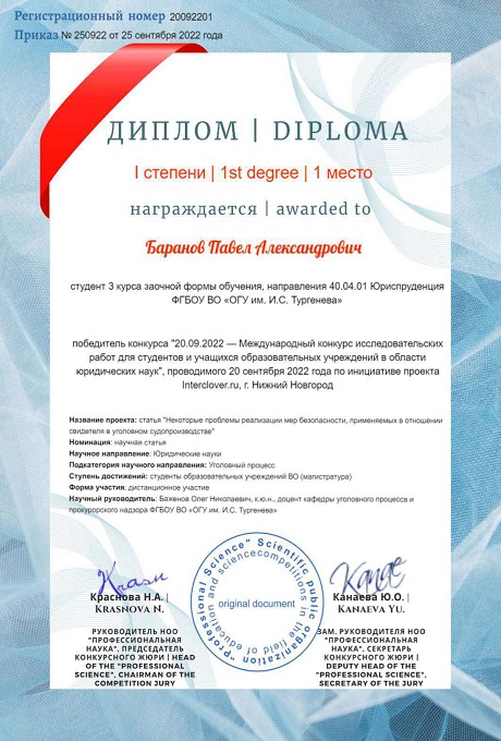 20 сентября 2022г. студент 3 курса заочной формы обучения направление подготовки 40.04.01 Юриспруденция, профиль Уголовное право и процесс, Баранов Павел Александрович стал победителем, заняв I место, в Международном конкурсе исследовательских работ для студентов и учащихся образовательных учреждений в области юридических наук. Научное руководство осуществлял доцент кафедры уголовного процесса и прокурорского надзора, кандидат юридических наук, доцент Баженов Олег Николаевич.